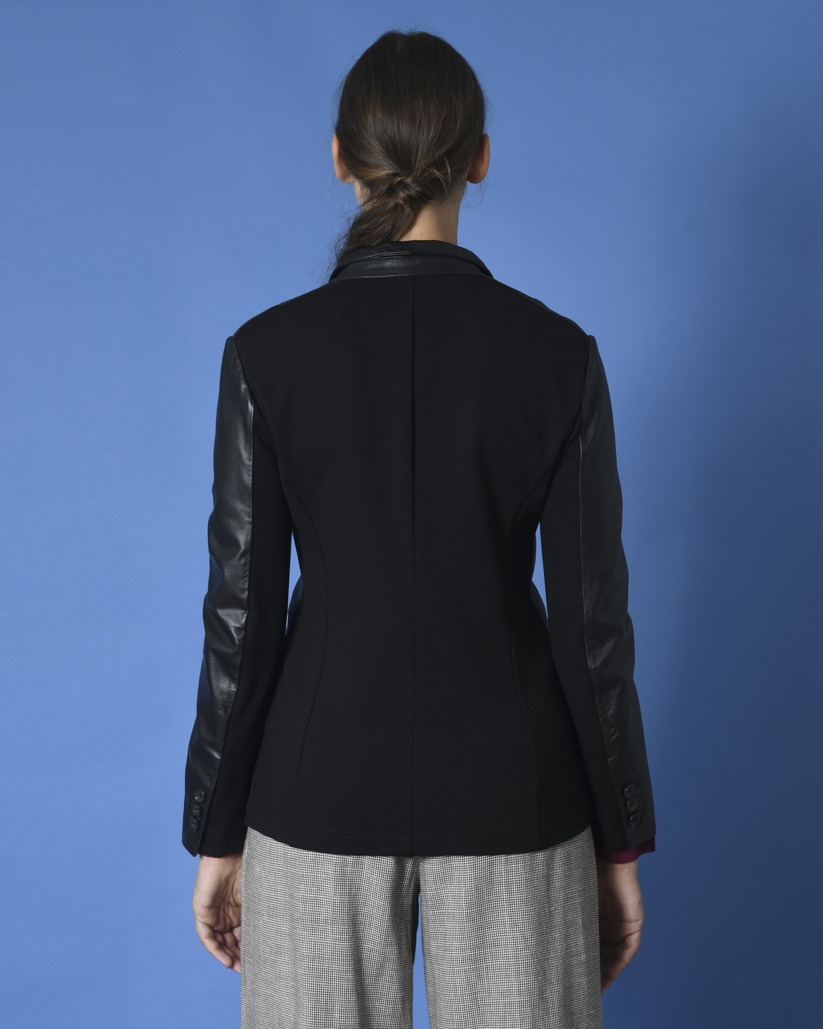 Cette veste bi-matière est la pièce créative et élégante qu’il vous faut. Elle est faite de cuir d'agneau à l'avant et viscose à l'arrière.