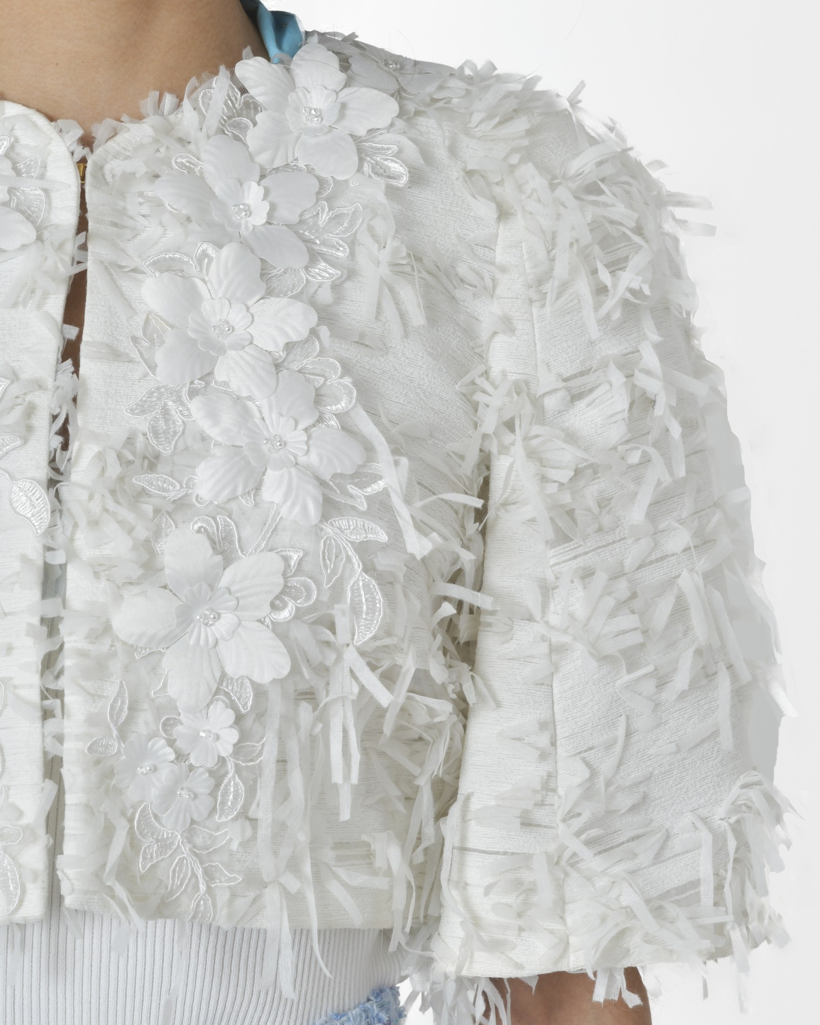Veste blanche Edward Achour : Détails: Veste boléro, courte, col rond, fantaisie au niveau de la broderie, manches courtes, chaînette intérieure de maintien, sans poches, fermeture agrafe milieu devant.