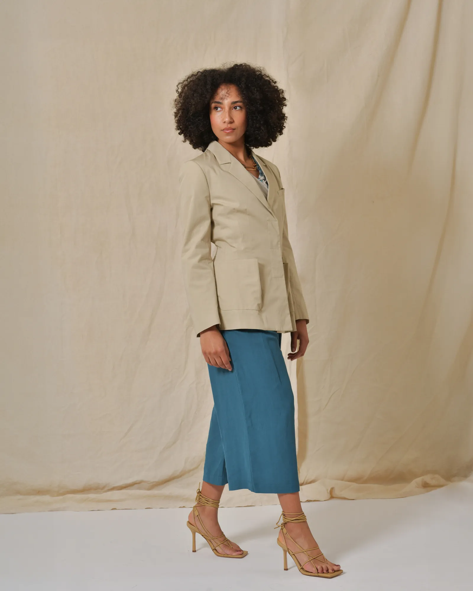Cette veste de la marque Hache se distingue par sa coupe originale et structurée. Confectionnée en coton taupe, elle est sublimée par plusieurs pinces le long de la taille, offrant un ajustement saisissant et une silhouette élégante. Elle est également dotée de poches larges et spacieuses, alliant style et fonctionnalité pour une allure à la fois moderne et pratique.