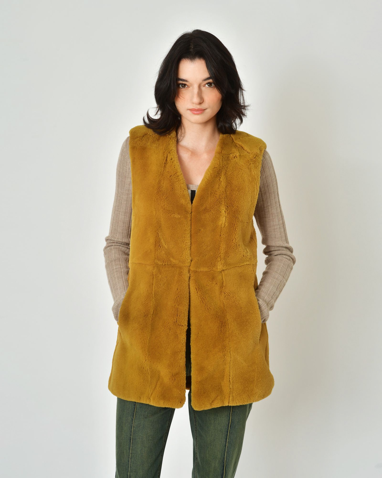 Cette veste en fourrure de lapin sans manches, dans une teinte moutarde est entièrement doublée de laine et offre une chaleur enveloppante tout en ajoutant une note de luxe. Les détails en daim à l'intérieur ajoutent une touche supplémentaire de sophistication. Prête à vous accompagner avec style, cette veste incarne l'élégance et le confort pour une allure moderne et chic.