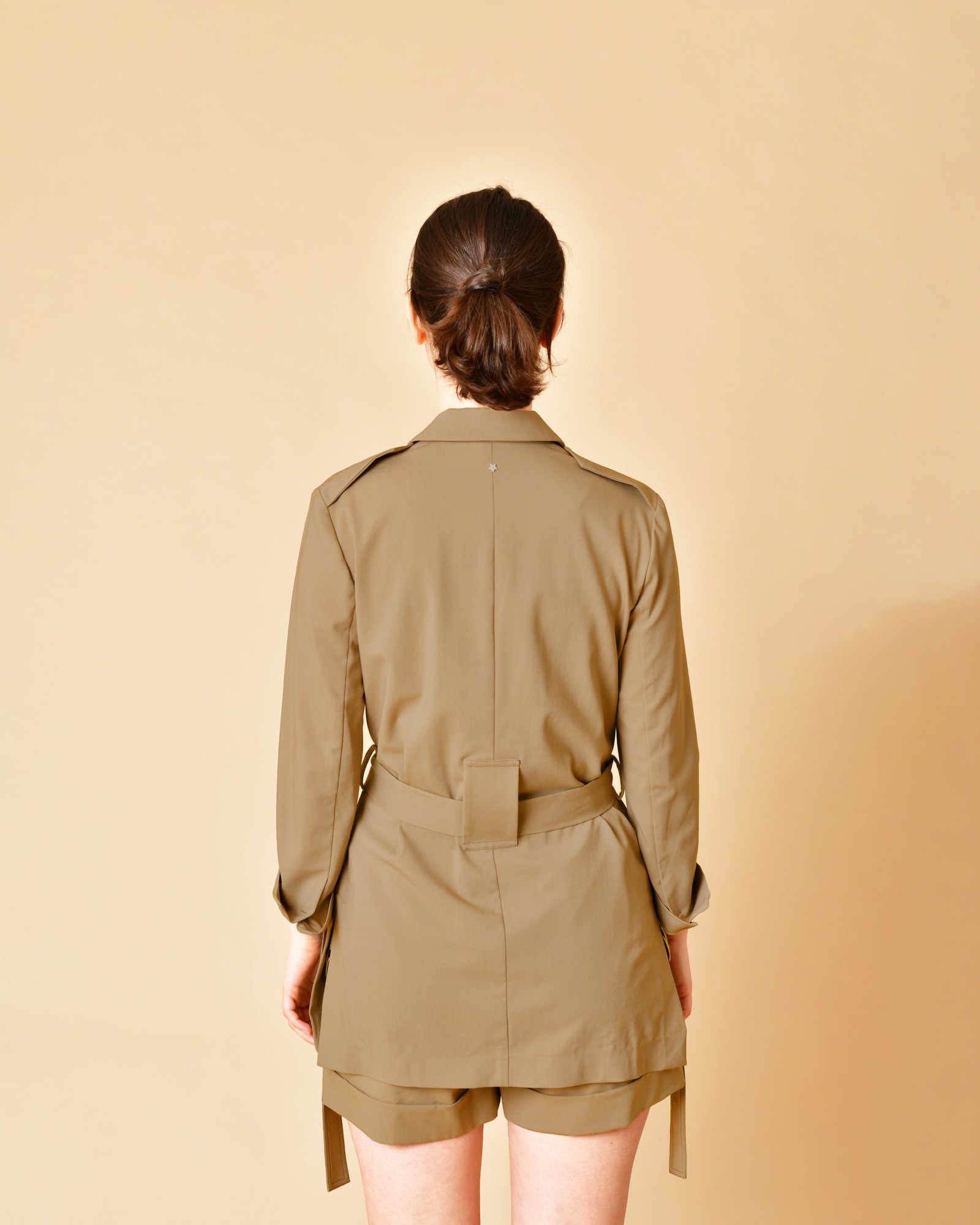Cette veste en laine vierge Lorena Antoniazzi, dans une teinte kaki clair sophistiquée, possède une coupe droite élégante et quatre poches pratiques, avec une ceinture pour cintrer la taille et affiner la silhouette.