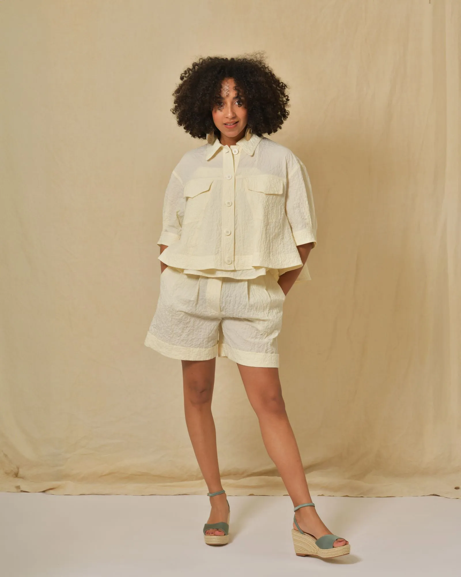 Cette veste en coton mélangé texturé signée AVN séduit par son tissu original et sa coupe évasée élégante. Dotée de manches courtes plissées et de deux poches sur le devant, elle allie modernité et raffinement pour un look structuré et sophistiqué pour cet été.