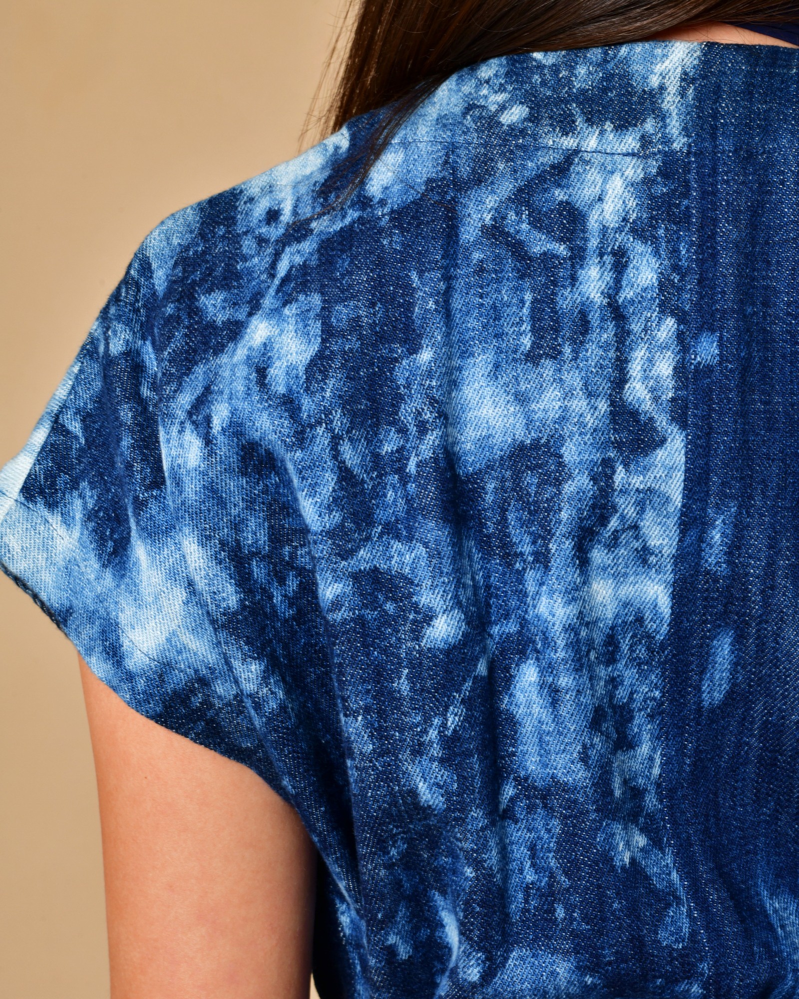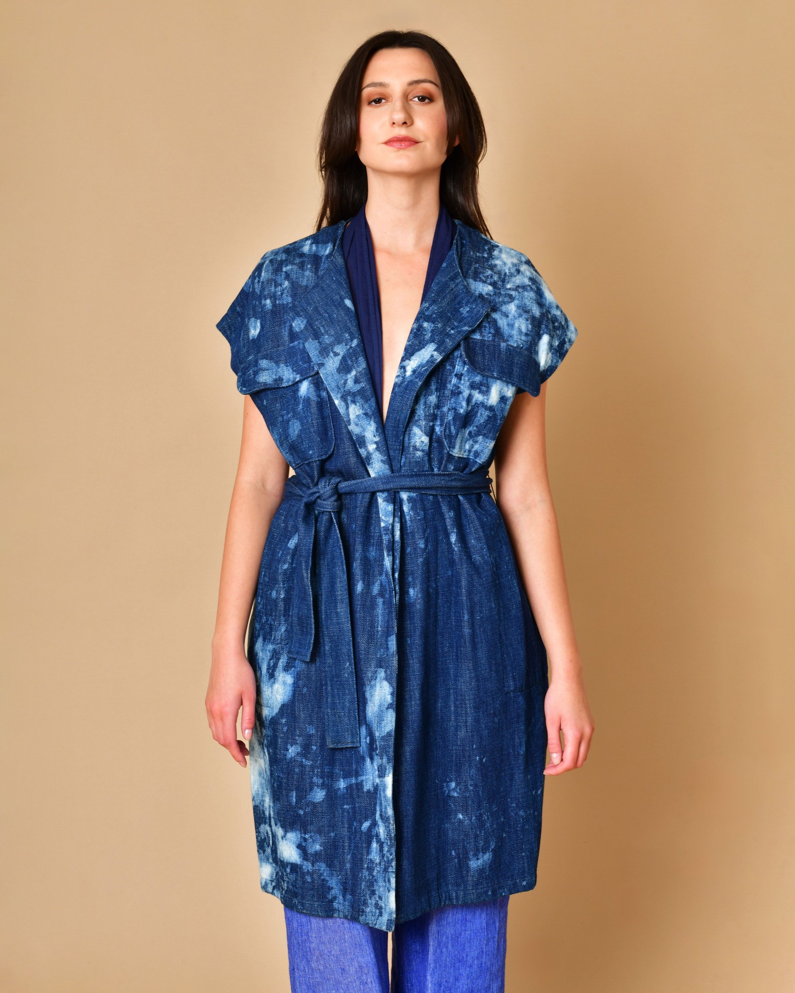 Découvrez cette veste sans manches en jean de la marque Diega, dans un bleu foncé avec des taches claires stratégiquement placées. Dotée de quatre poches très utilitaires à l'avant, cette veste allie style et fonctionnalité pour un look décontracté et tendance.