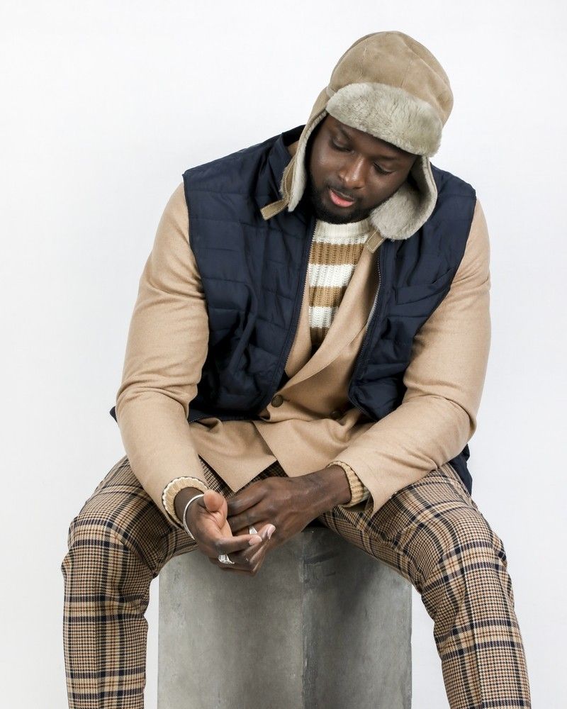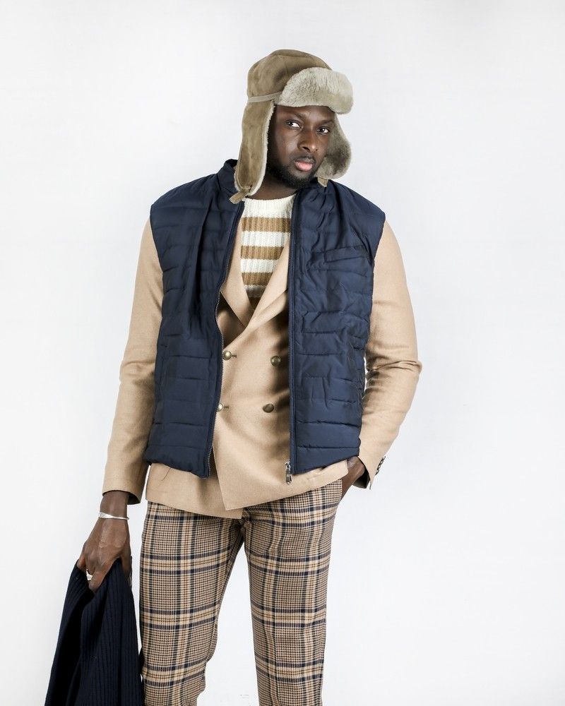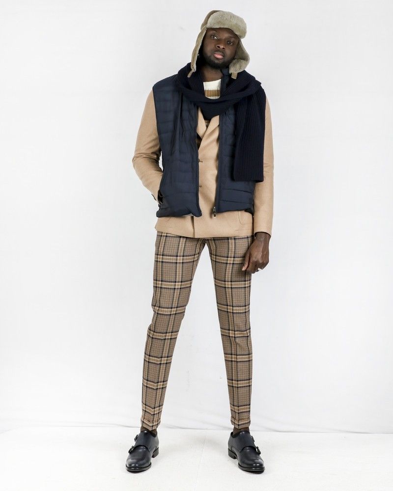 Veste tailleur à rayures verticales marron et bleu Fugàto
