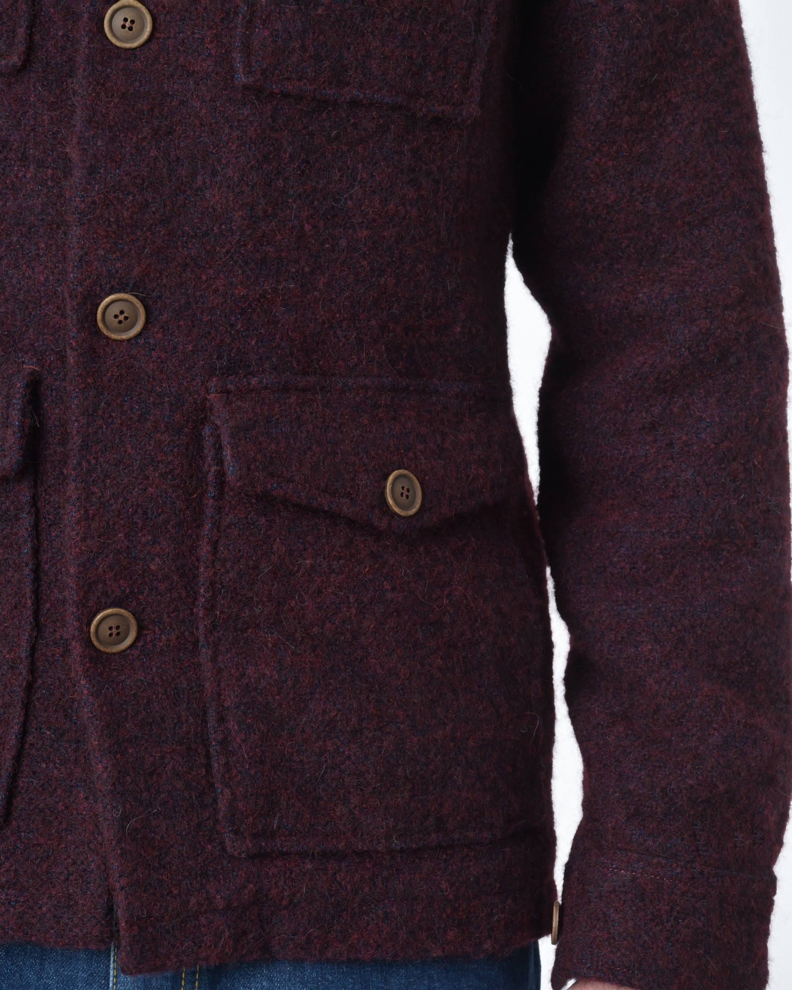 Veste bordeaux Borsa : Détails: Veste bordeaux laine duveteuse, 4 poches sur le devant, col chemisier, fente poignet, fermeture boutons milieu devant