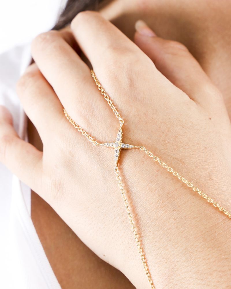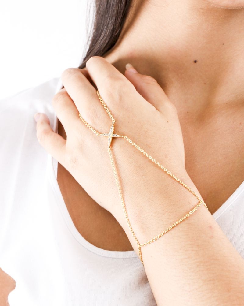 - Les fines chaînes de ce bracelet Elizabeth and James encerclent le poignet et la main, puis s'enroulent autour du doigt.