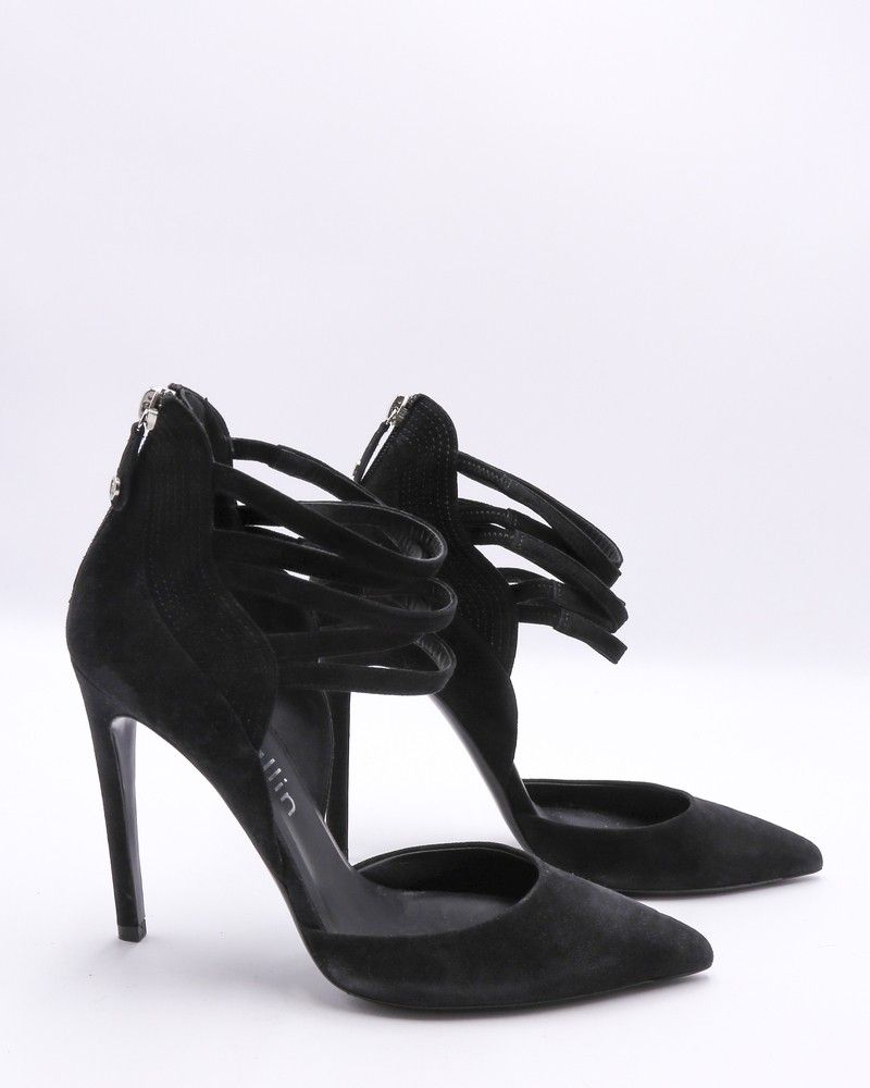 Ces escarpins pointus, réalisés en Italie en daim noir, sont agrémentés de multiples brides à la cheville.