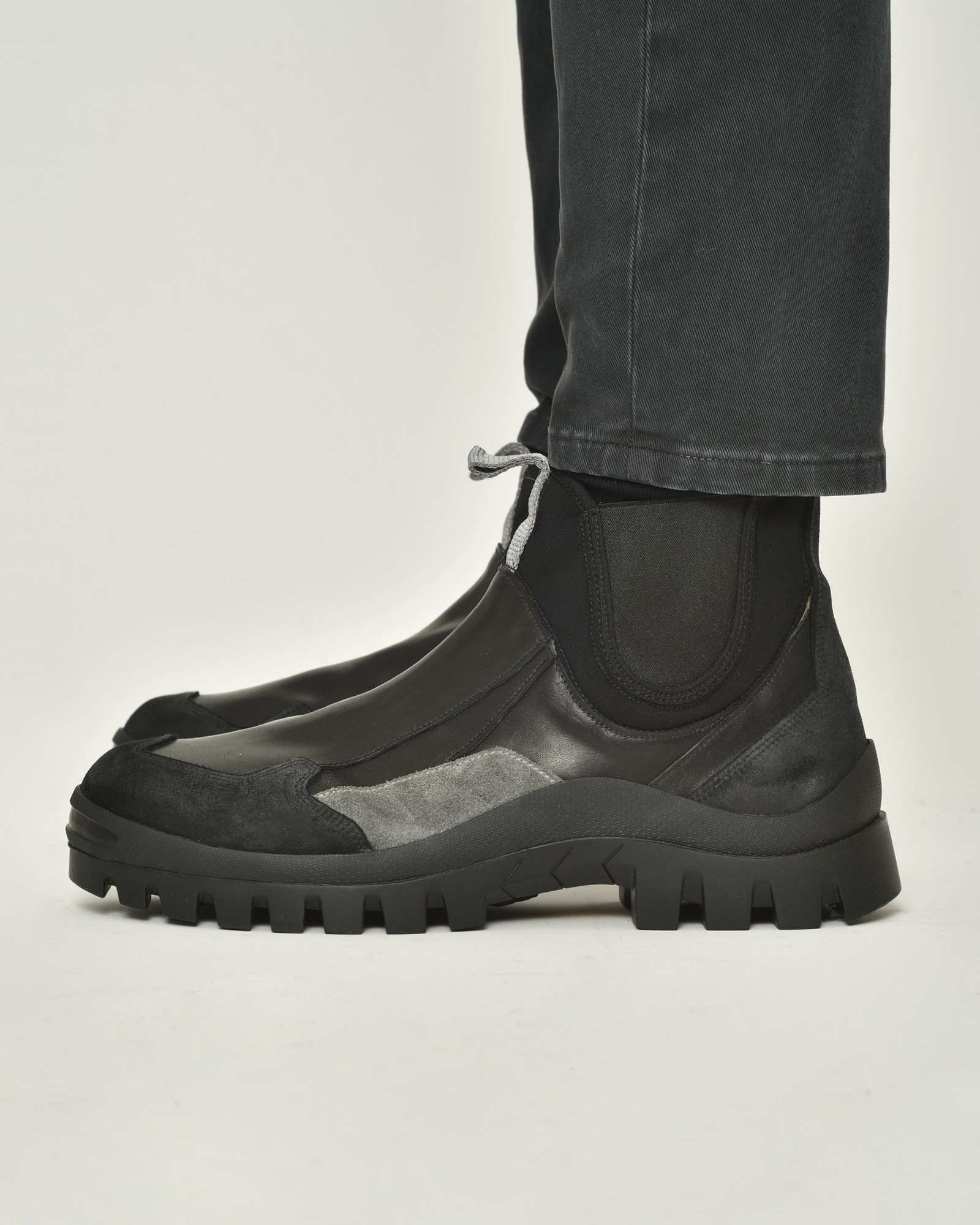 Bottine en cuir élégante, agrémentée de détails en divers tissus tout autour et une semelle crantée. L’ouverture élastiquée assure une facilité d’enfilage et un confort optimal.