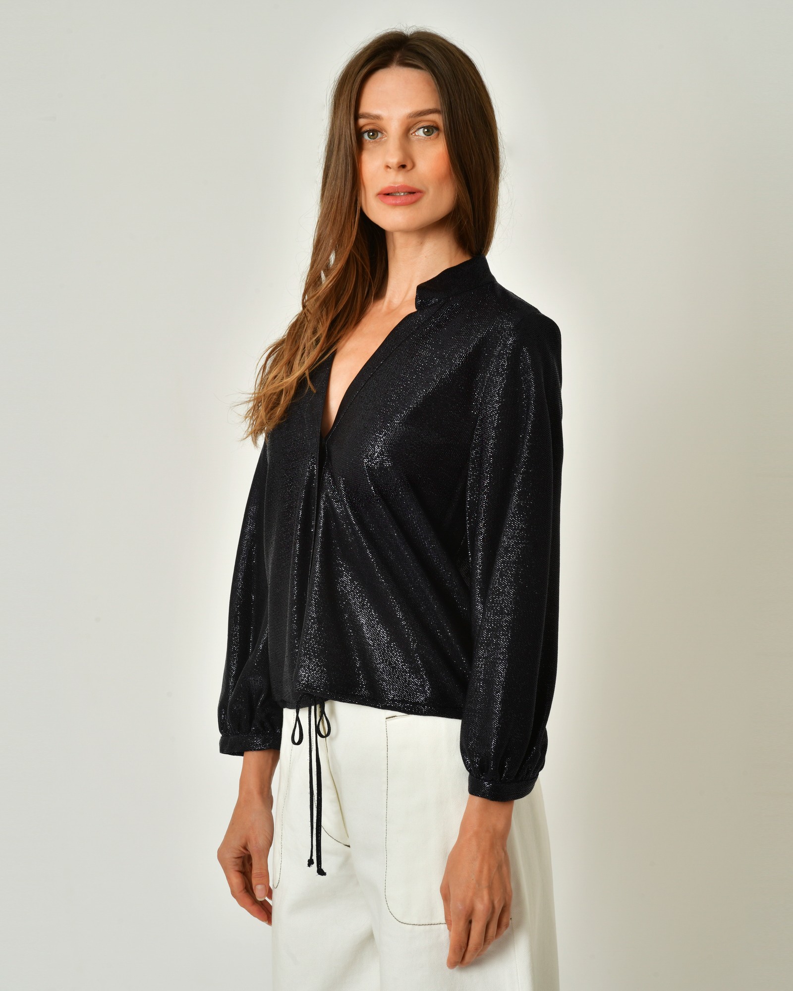 Découvrez l'élégance décontractée avec notre blouse en viscose mélangée bleu rehaussée de fils métalliques. Sa coupe large et son col en V apportent une touche moderne, tandis que les manches longues légèrement ballonnées ajoutent une note délicate. Parfaite pour toutes les occasions, cette blouse allie confort et style.