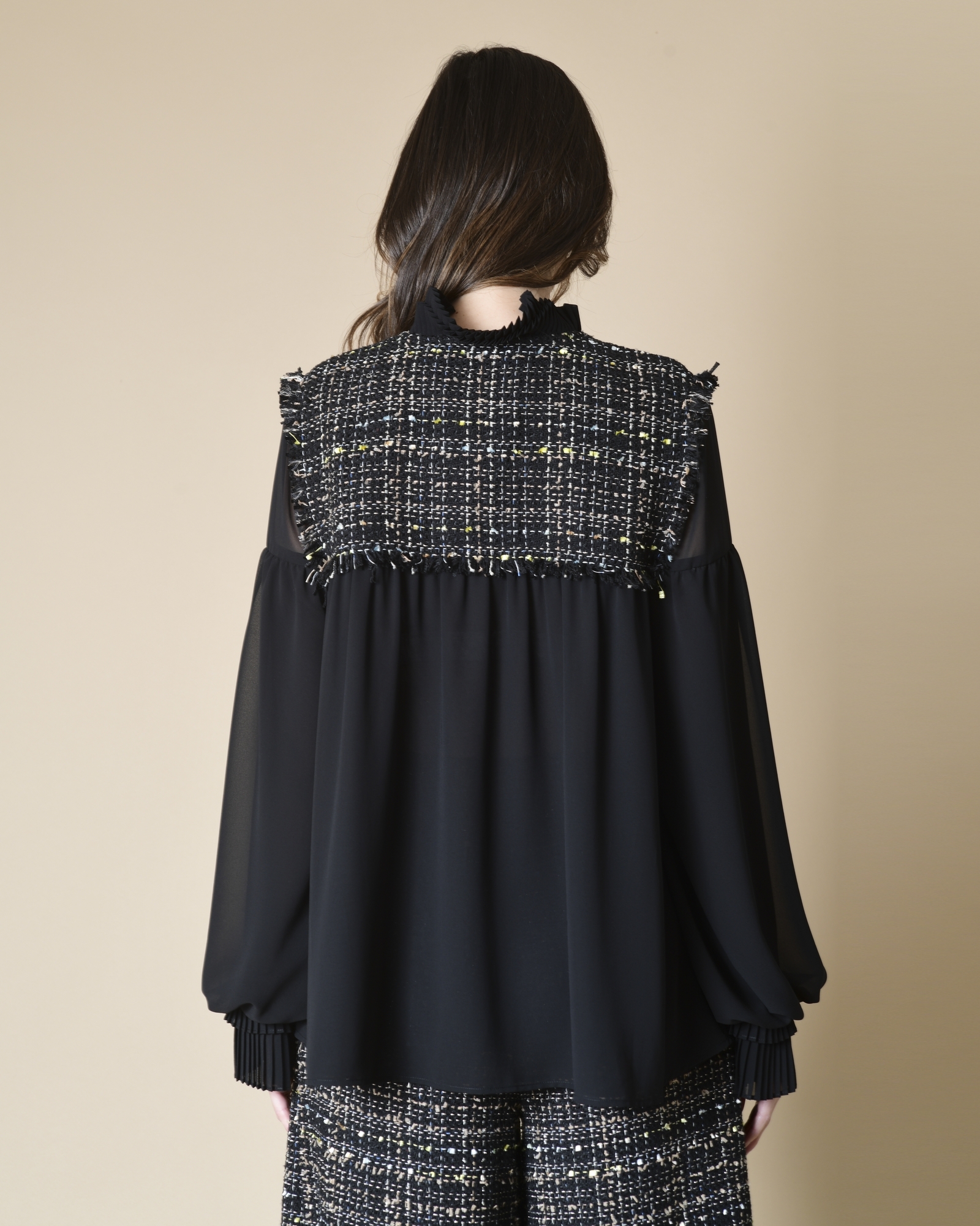 Mi-tweed, Mi-crêpe, cela ne peut être que du Edward Achour. Son originalité sans faille ne cesse de nous surprendre, preuve est, ce chemise avec buste en tweed et boutonnage doré (signature du créateur), orné d’un nœud et d’un col fraise. Réalisé en crêpe tout en légèreté avec des manches bouffantes et une coupe et vaporeuse en bas.