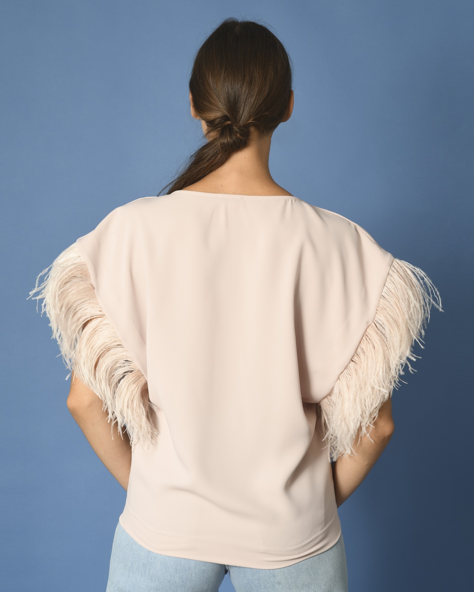Cette blouse rose donne une sensation de voler avec ses plumes.