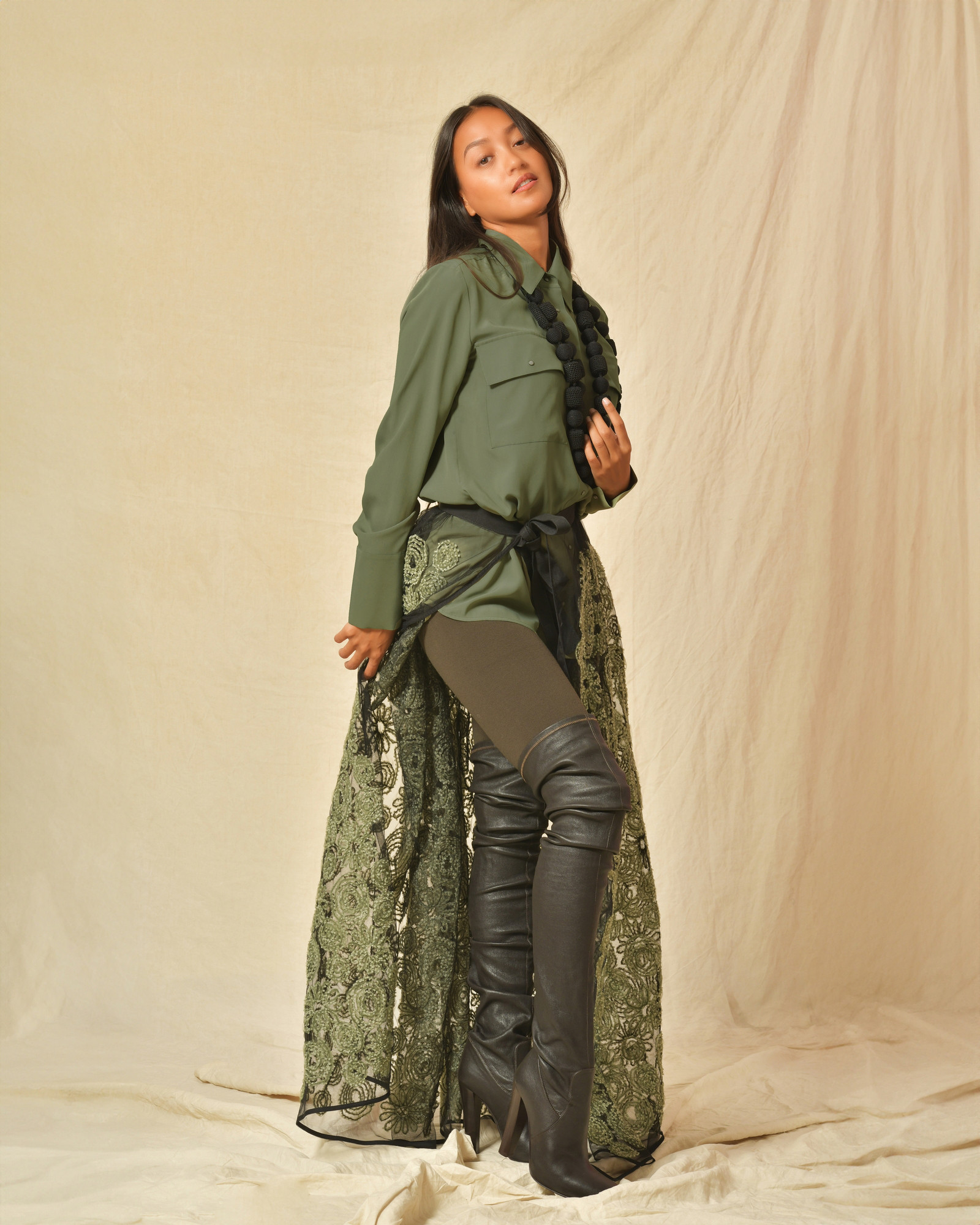 Découvrez cette élégante chemise kaki de la marque Lorena Antoniazzi. Dotée d'une bande à boutonnage pression à l'avant et aux poignets, elle comporte également deux grandes poches à rabats boutonnés. Parfaite pour un look raffiné et sophistiqué, cette chemise ajoute une touche de style à votre garde-robe.