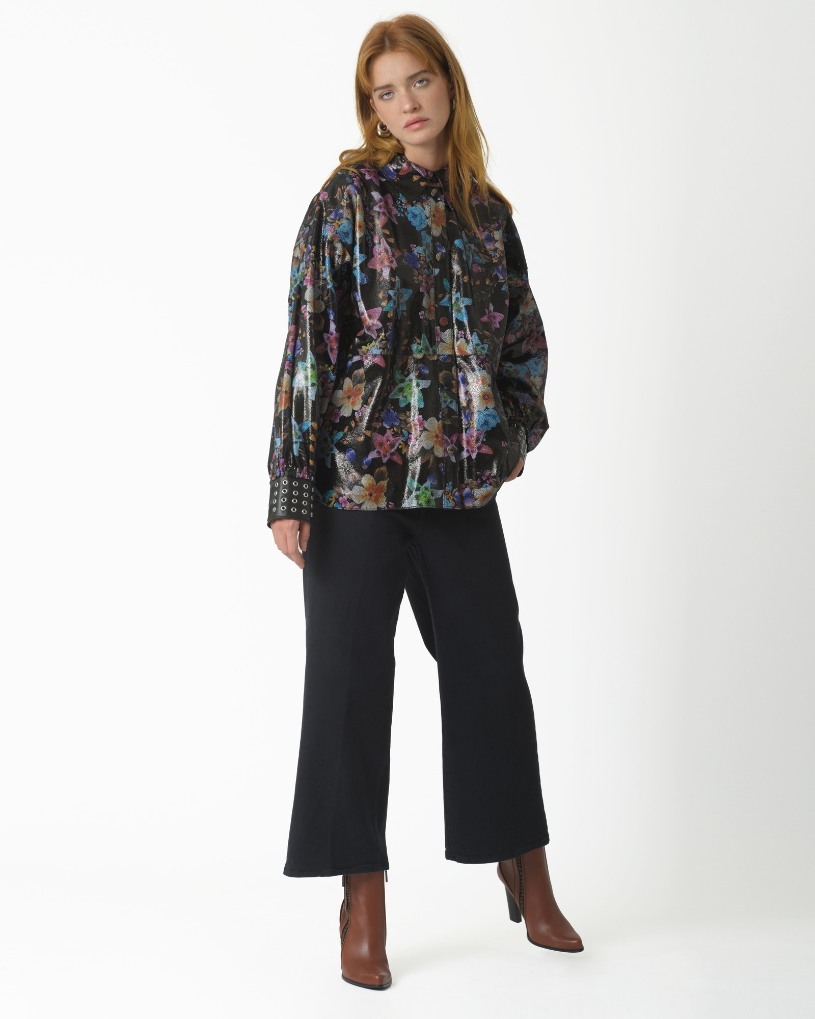 Chemise en cuir vernis Stand Studio. Détails: motif fleuri multicolore, système de boutonnage standard milieu devant, bas de manche ornementée.