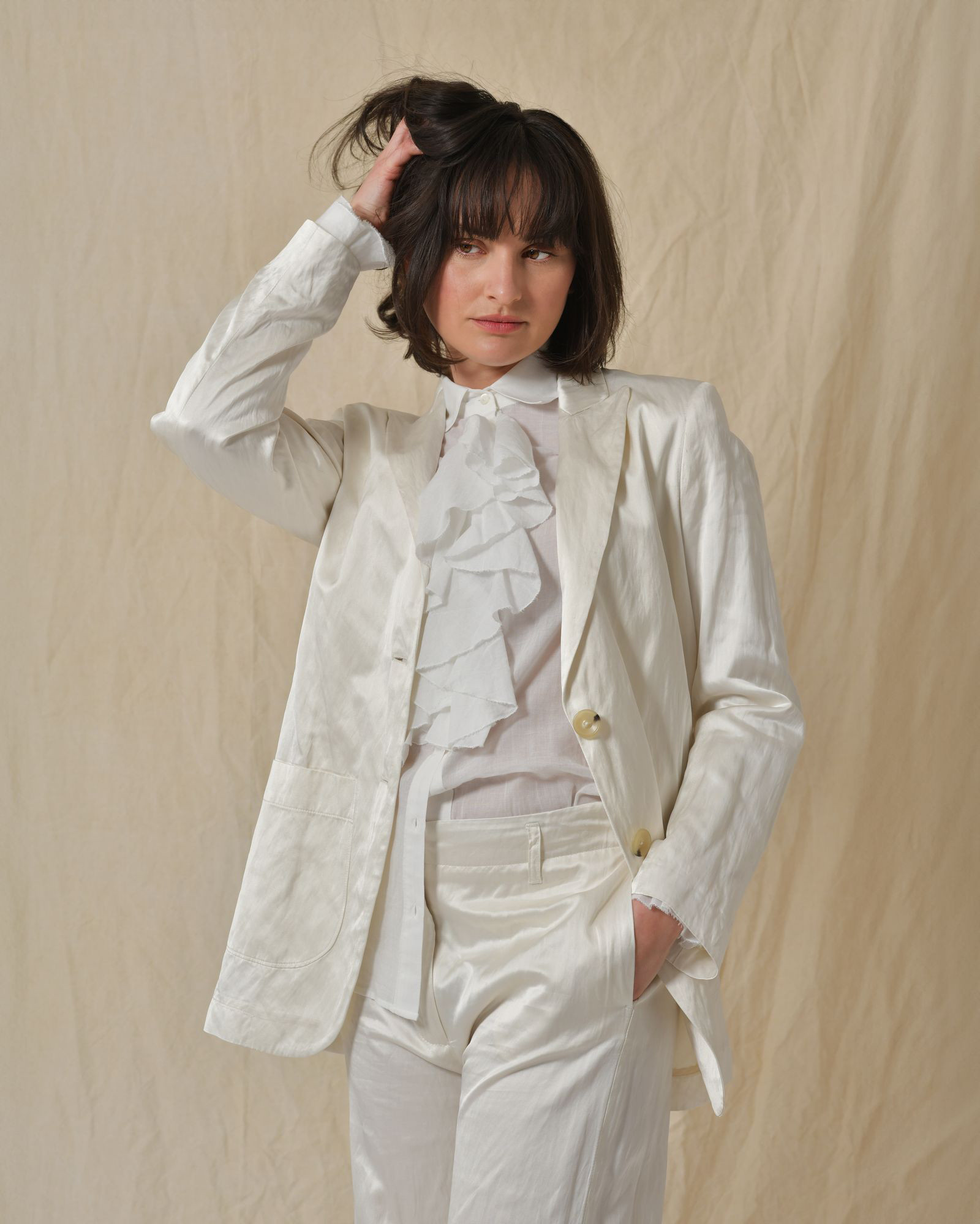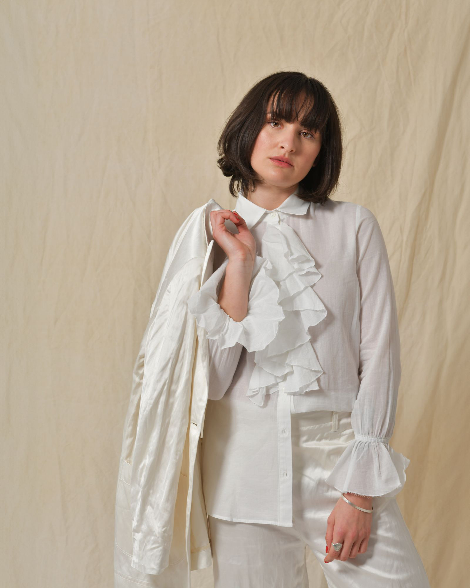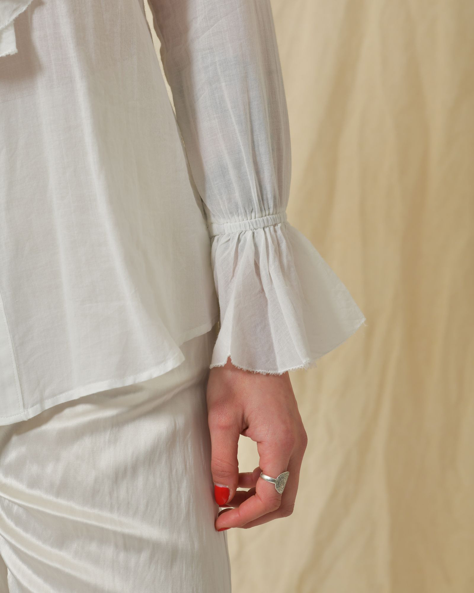 Chemisier en coton à volants Diega. Ce modèle raffiné se distingue par ses volants délicats ornant le bas du col et l’ourlet des manches, apportant une touche de féminité et d’élégance à votre tenue. Sa coupe fluide en fait une pièce idéale pour un look chic et décontracté.