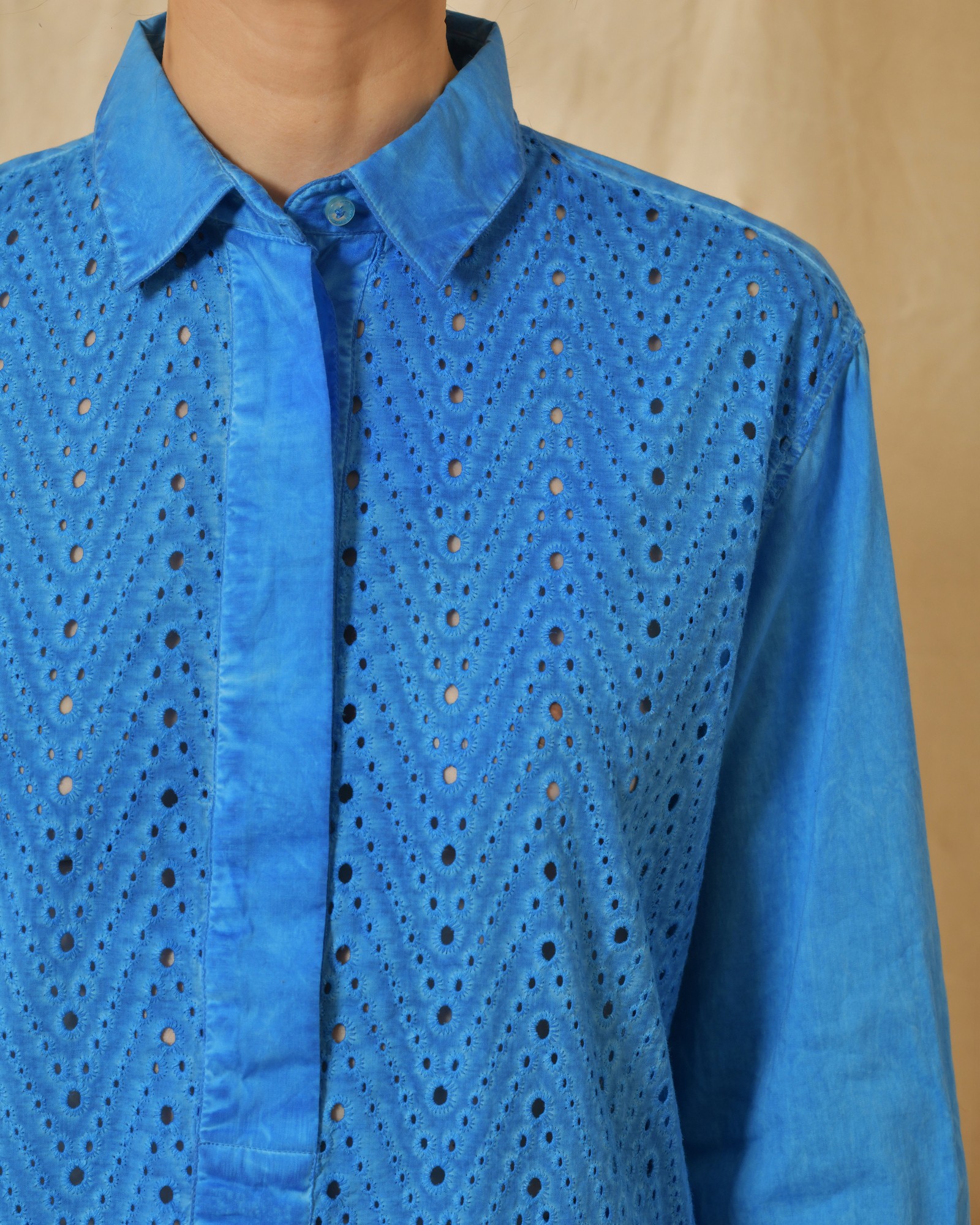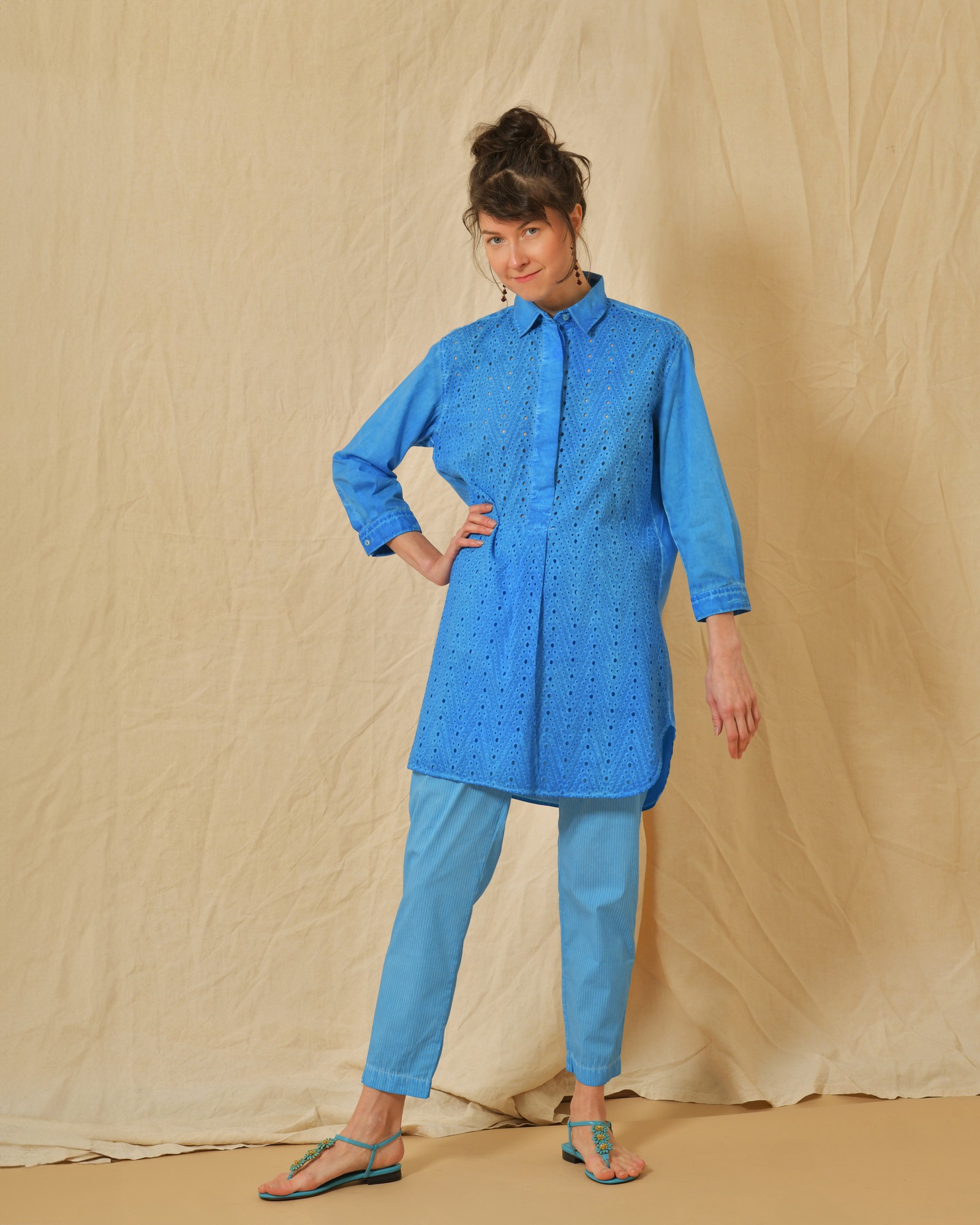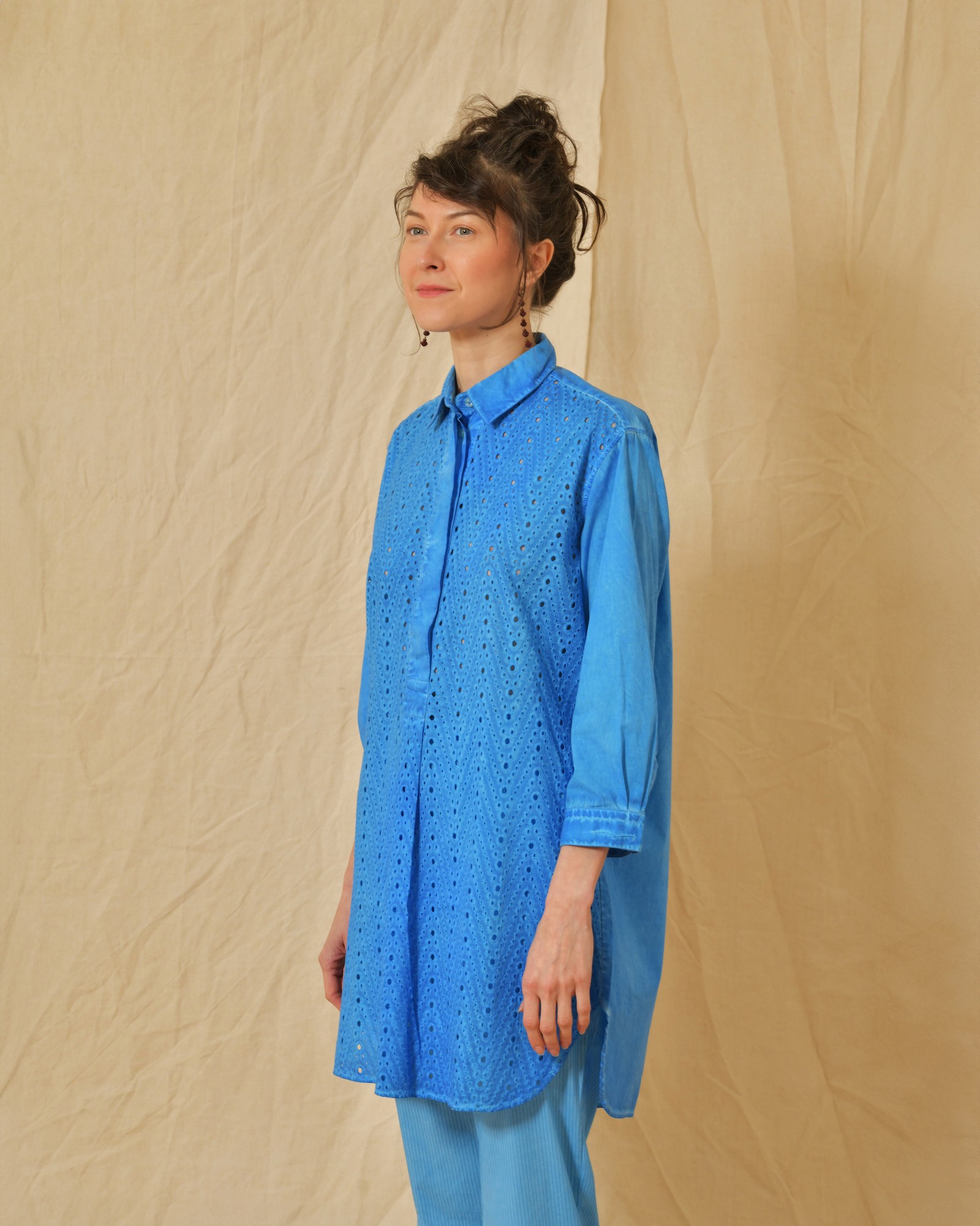 Confectionné dans un coton bleu teinté perforé, ce chemisier signé Ploumanac’h allie légèreté et élégance. Ses manches trois-quarts apportent une touche sophistiquée, parfaite pour un look raffiné et aéré en toute saison.