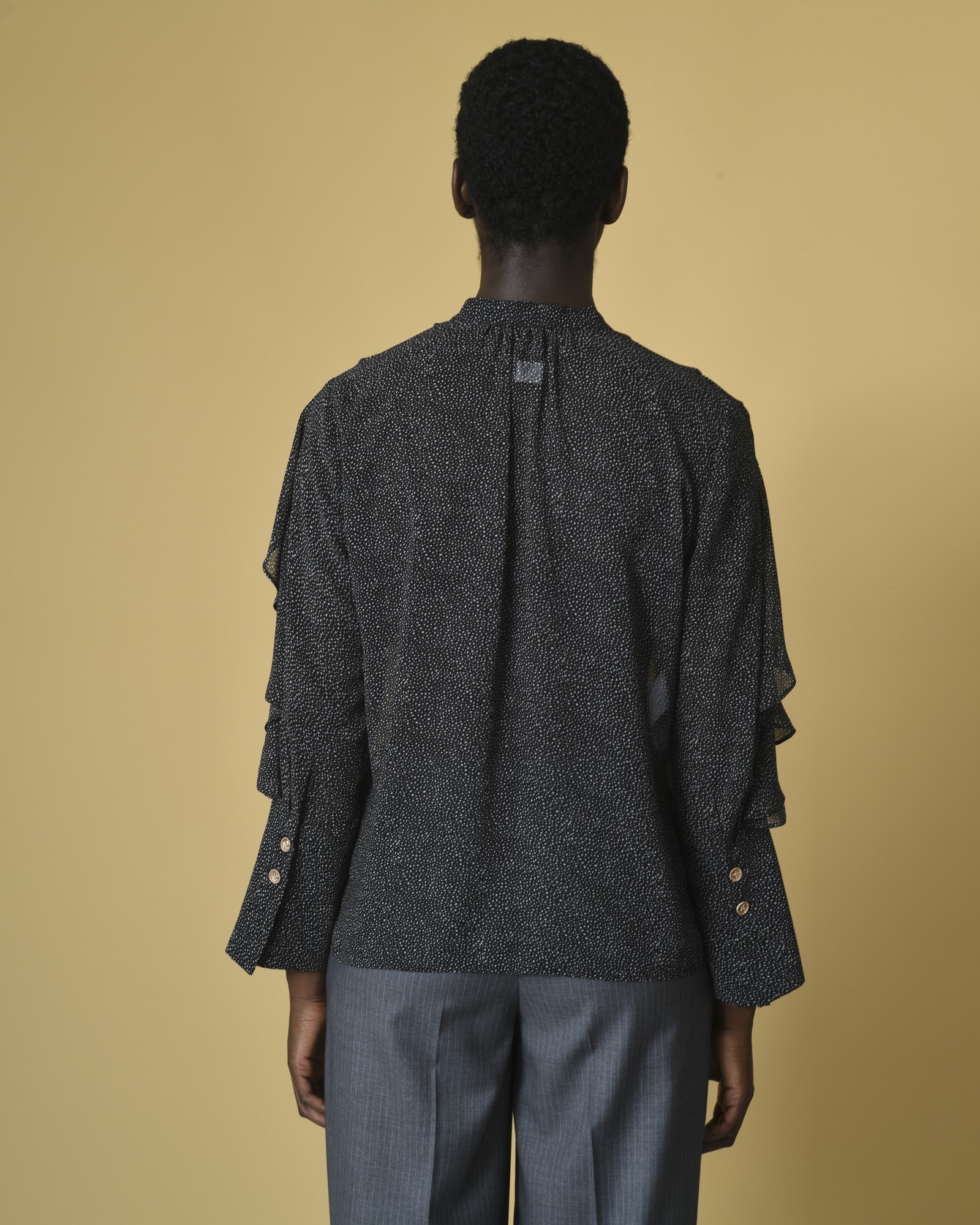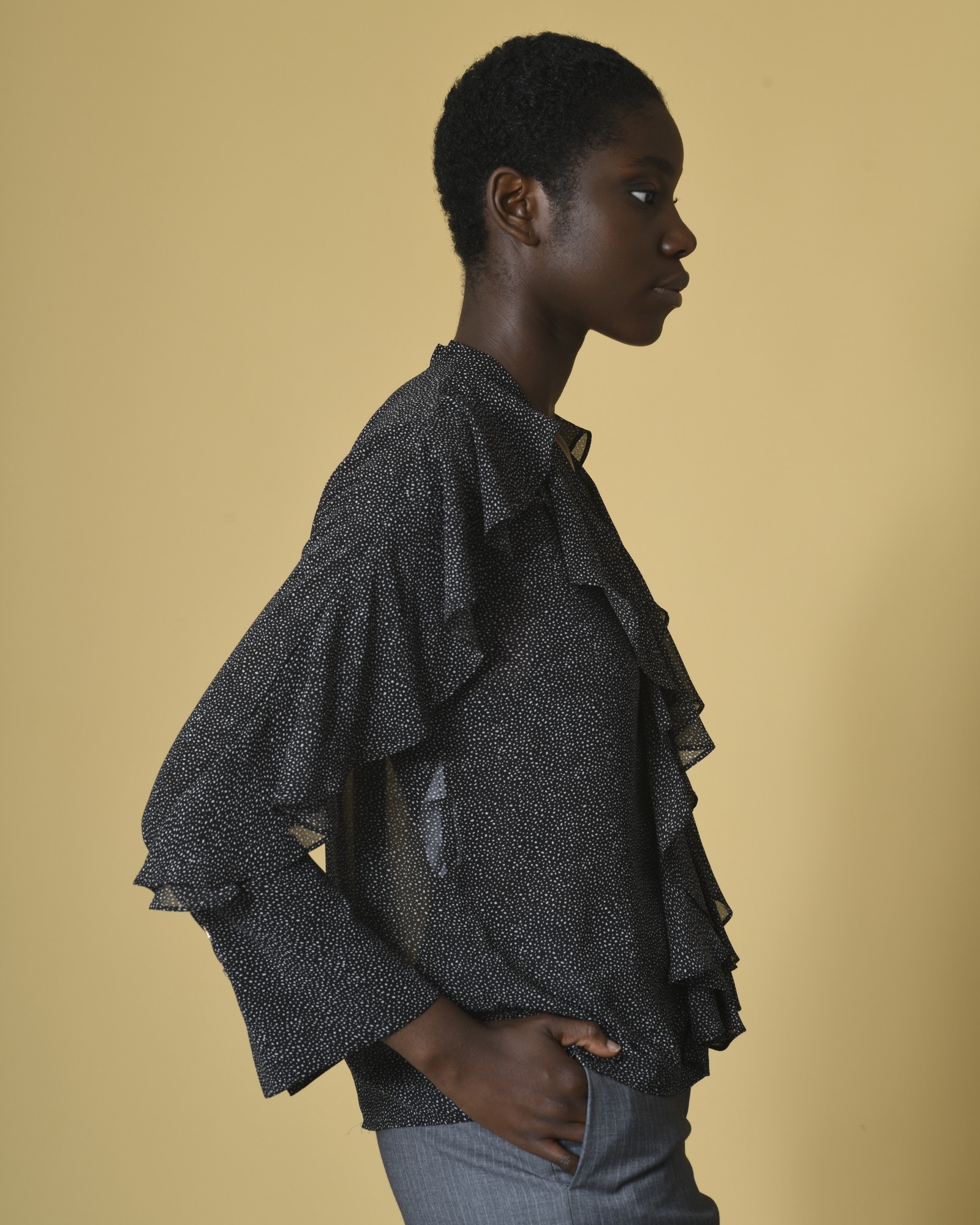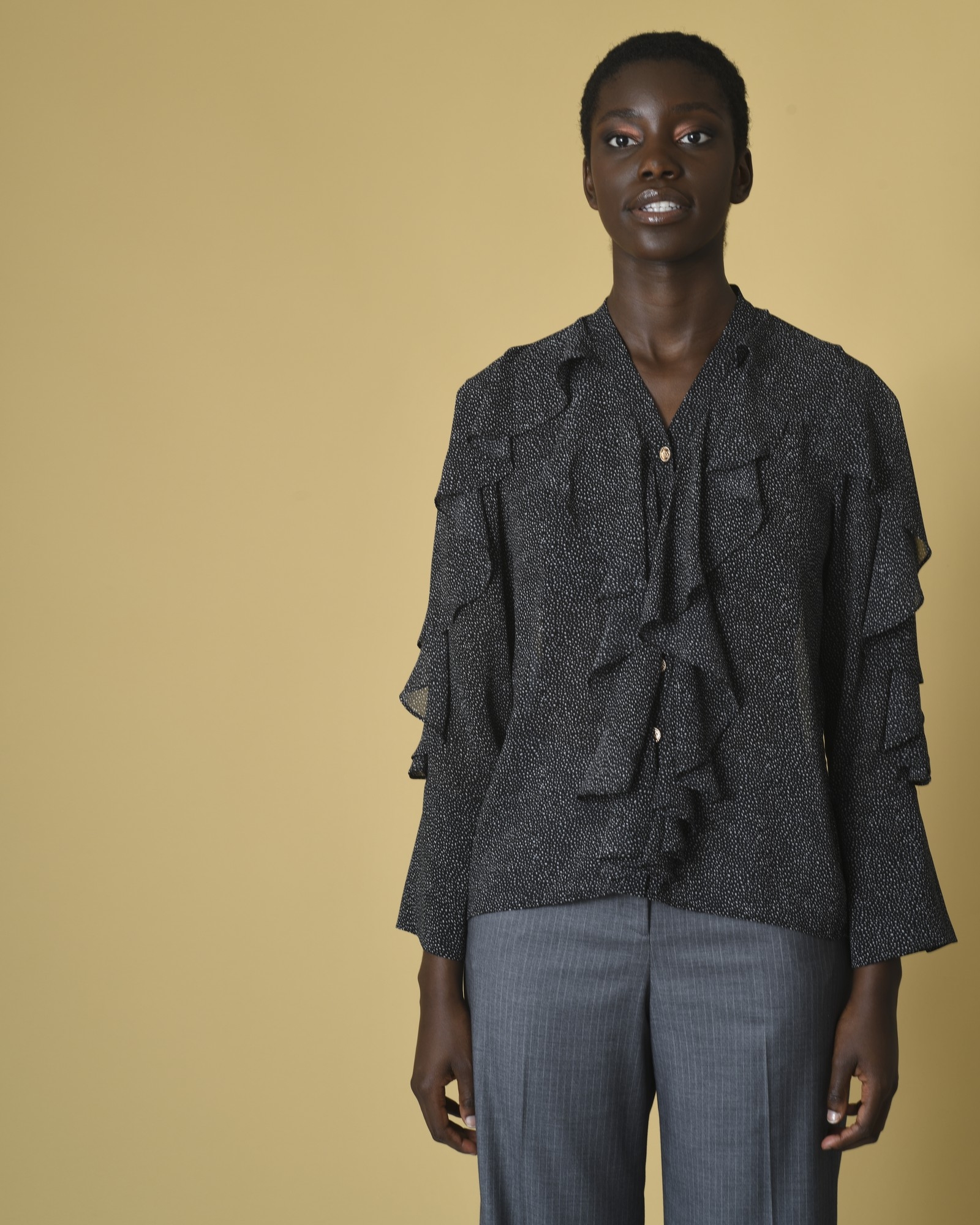 Ce chemisier à volants est réalisé en georgette imprimé de petits pois contrastants en formats variés. Glissez le à l’intérieur d’un pantalon taille haute.