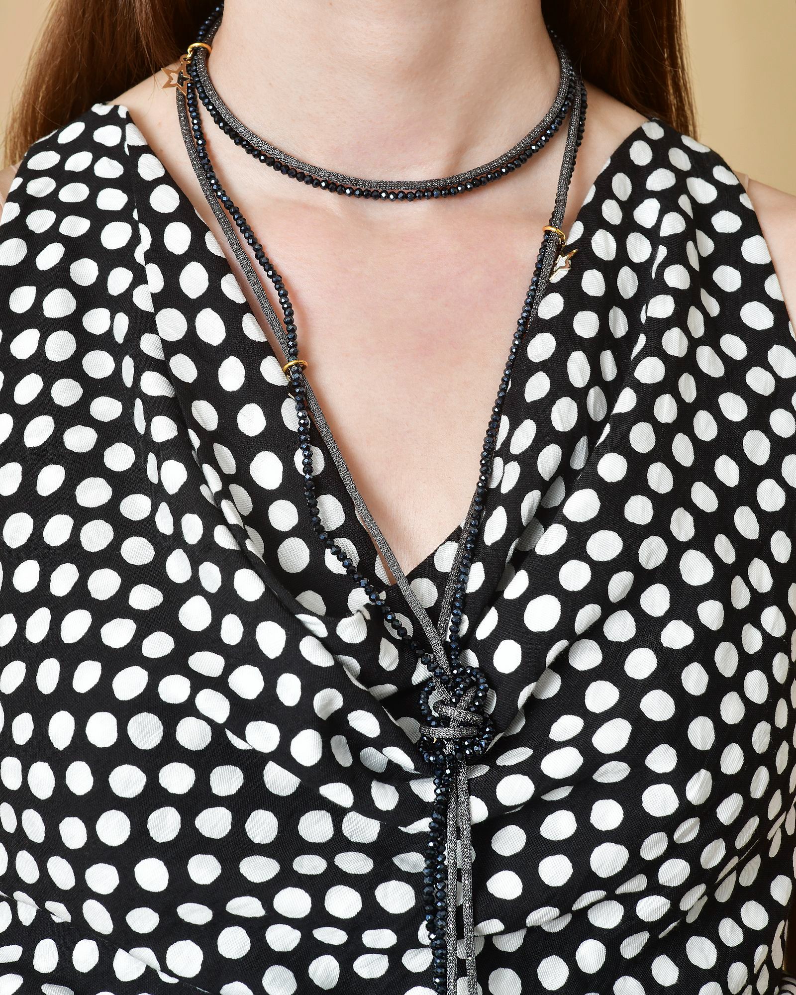 Découvrez le collier de perles bleu marine de Lorena Antoniazzi, une pièce élégante et polyvalente qui ne manquera pas de faire sensation. Sa longueur légèrement plus grande facilite la création de plusieurs tours autour du cou, offrant ainsi un style personnalisé et moderne. Avec son cordon gris, ce collier présente une combinaison de couleurs chic et sophistiquée. Les petits pendentifs sur le collier et au bout ajoutent une touche subtile de glamour, tandis que les petites étoiles de différentes tailles apportent une touche d'éclat et de féminité. Optez pour ce collier pour un look unique et tendance en toute occasion.