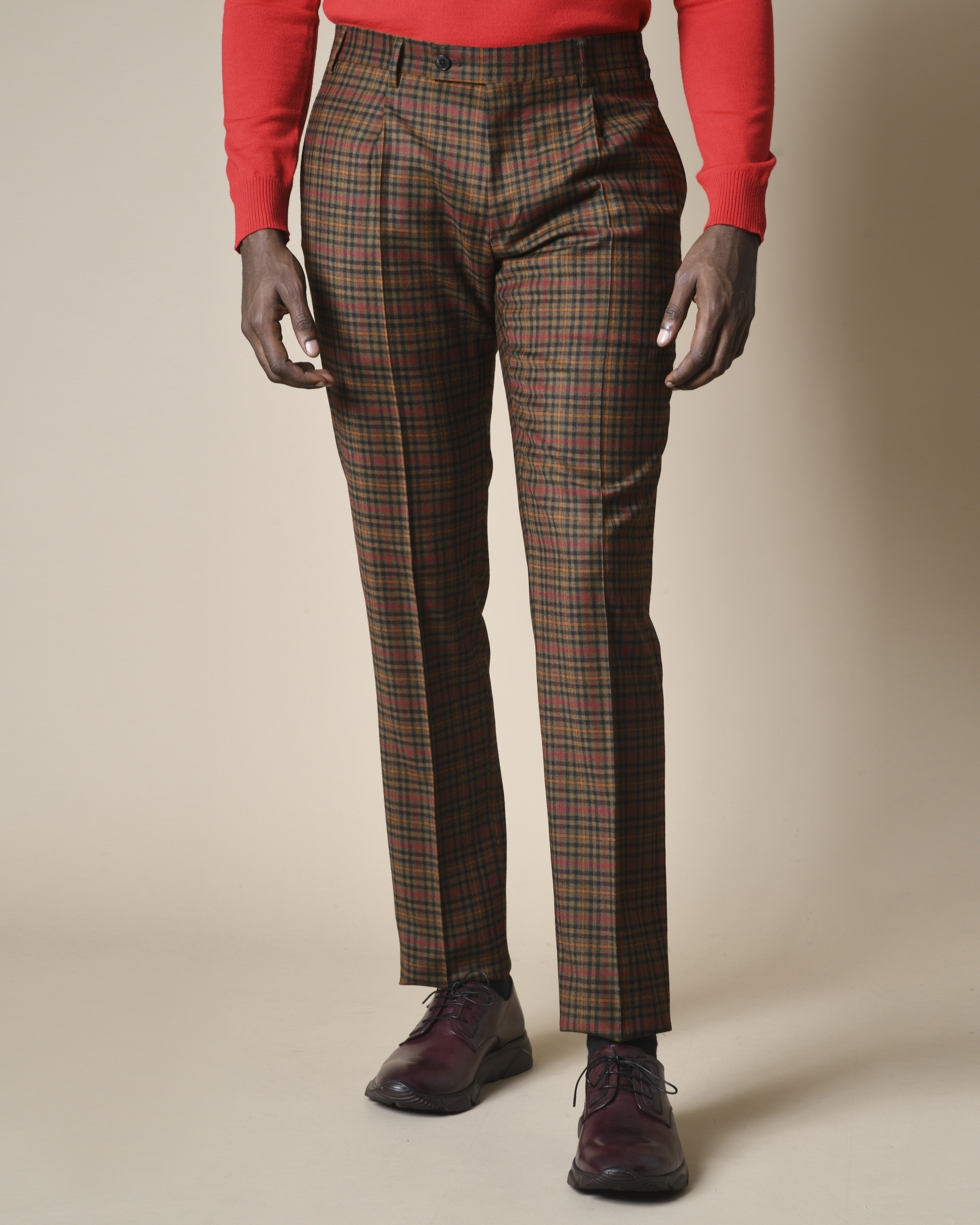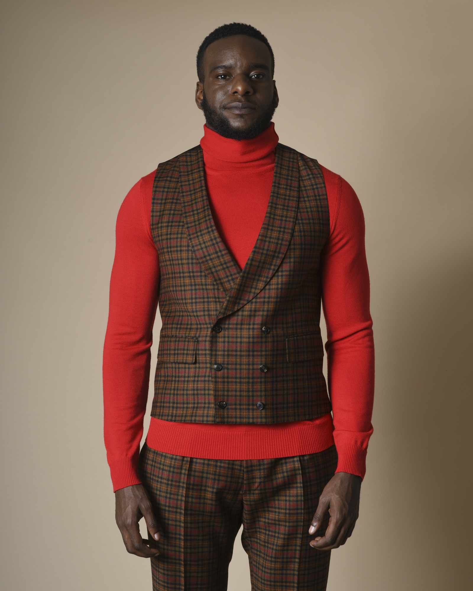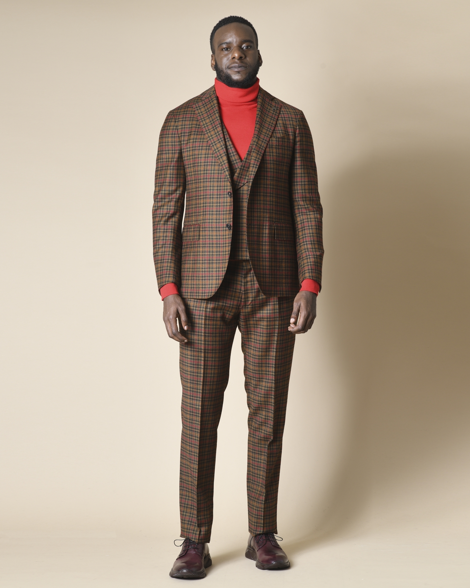 À l'esthétique décalée, ce costume marron réalisé en laine résistante et orné de carreaux orange, rouge et vert. La veste présente des revers en pointes élégants, une doublure partielle en satin à motif tête de mort emblème de la maison. Le gilet possède un double boutonnage, des poches à rabats et un dos réglable. Le pantalon est doté d’une taille mi haute et des plis sur le devant.