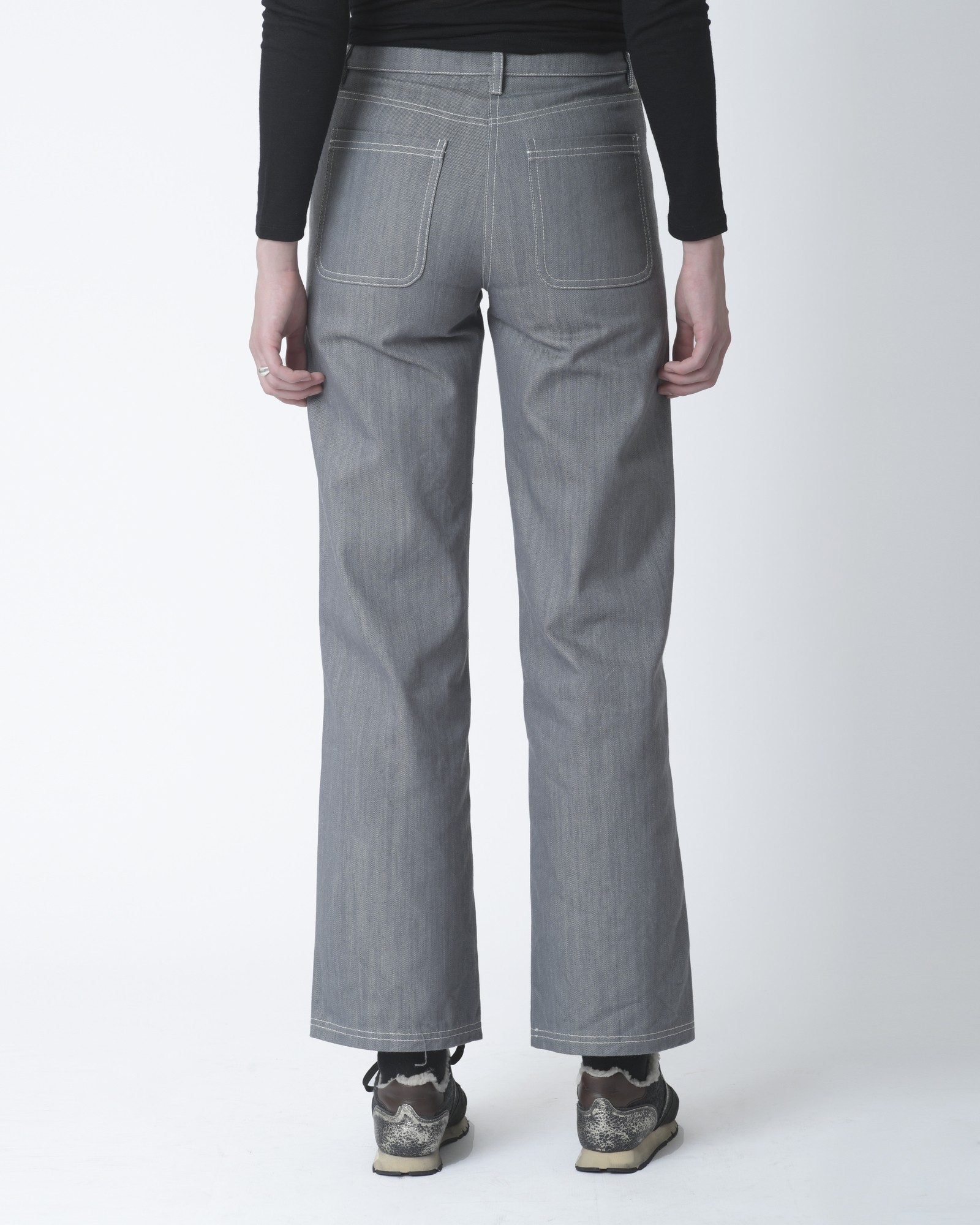 Jean coupe évasée AVN. Détails: taille haute, deux poches plaquées derrière, deux poches devant, système de fermeture standard: fermeture à glissière/bouton, surpiqûres contrastées blanches.