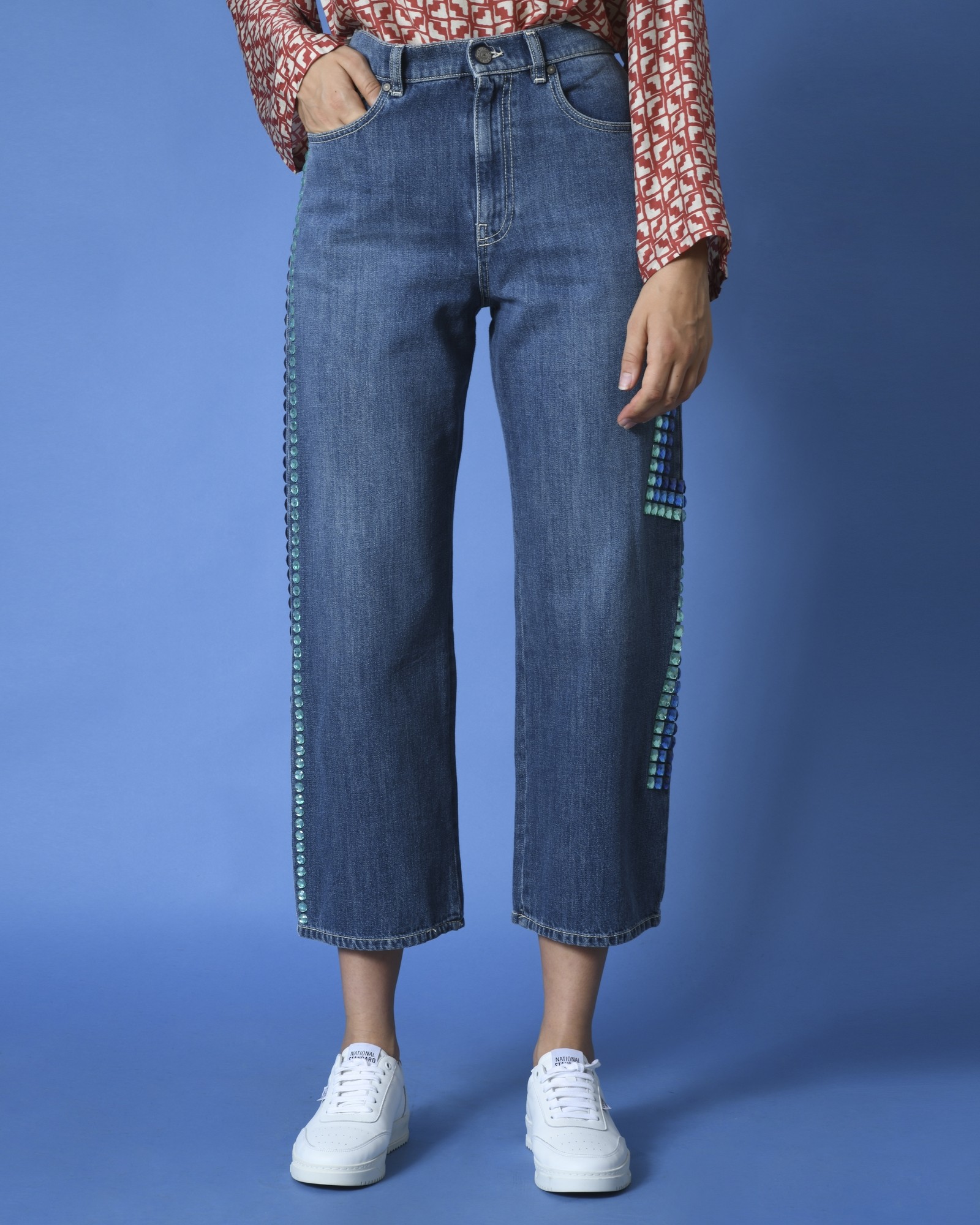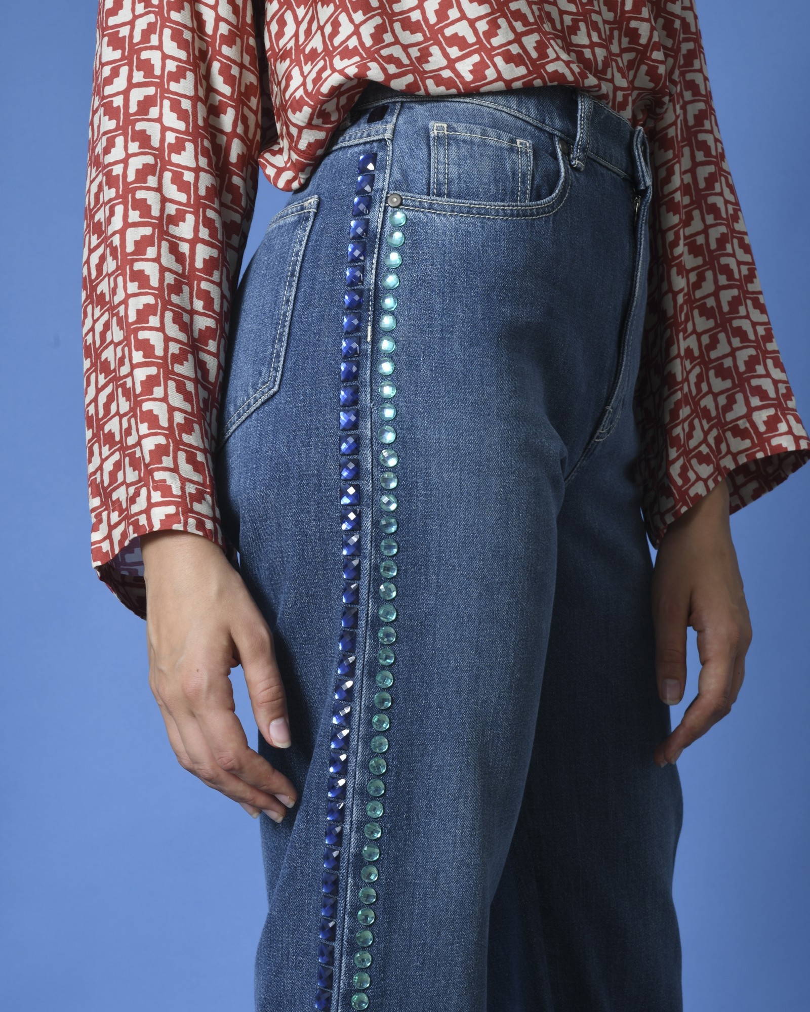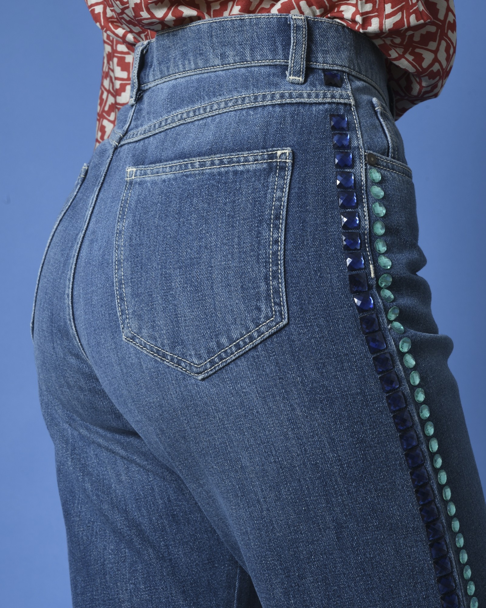 - Détail : jean droit avec strass asymétriques sur les jambes. Deux poches plaquées à l’arrière, deux poches cavalières sur le devant