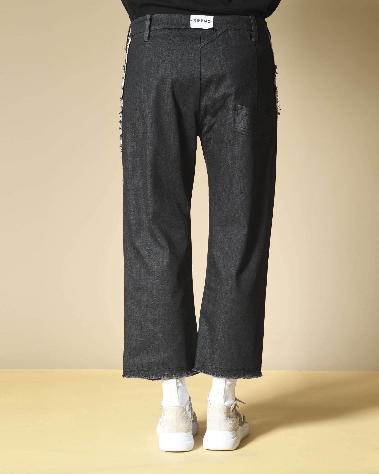 Effiloché sur les côtés et au niveau des chevilles, sa couleur grise et ses empiècements font toute la différence.