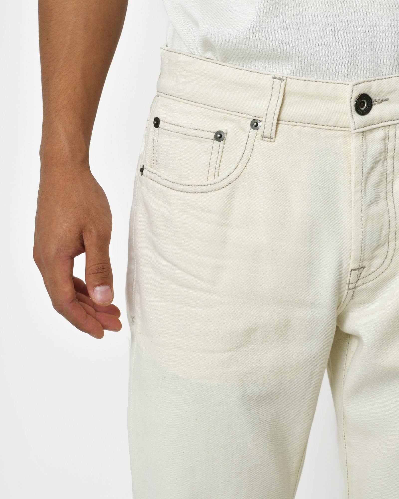 Ce pantalon en jeans est un incontournable pour une garde-robe tendance et décontractée. Sa teinte beige clair et ses coutures contrastées apportent une touche de style unique. Sa coupe droite flatteuse convient à toutes les occasions, tandis que l'effet froissé sur le devant ajoute une note d'originalité. Avec sa fermeture à simple bouton et zip, il allie confort et praticité. Un choix parfait pour vos tenues quotidiennes.