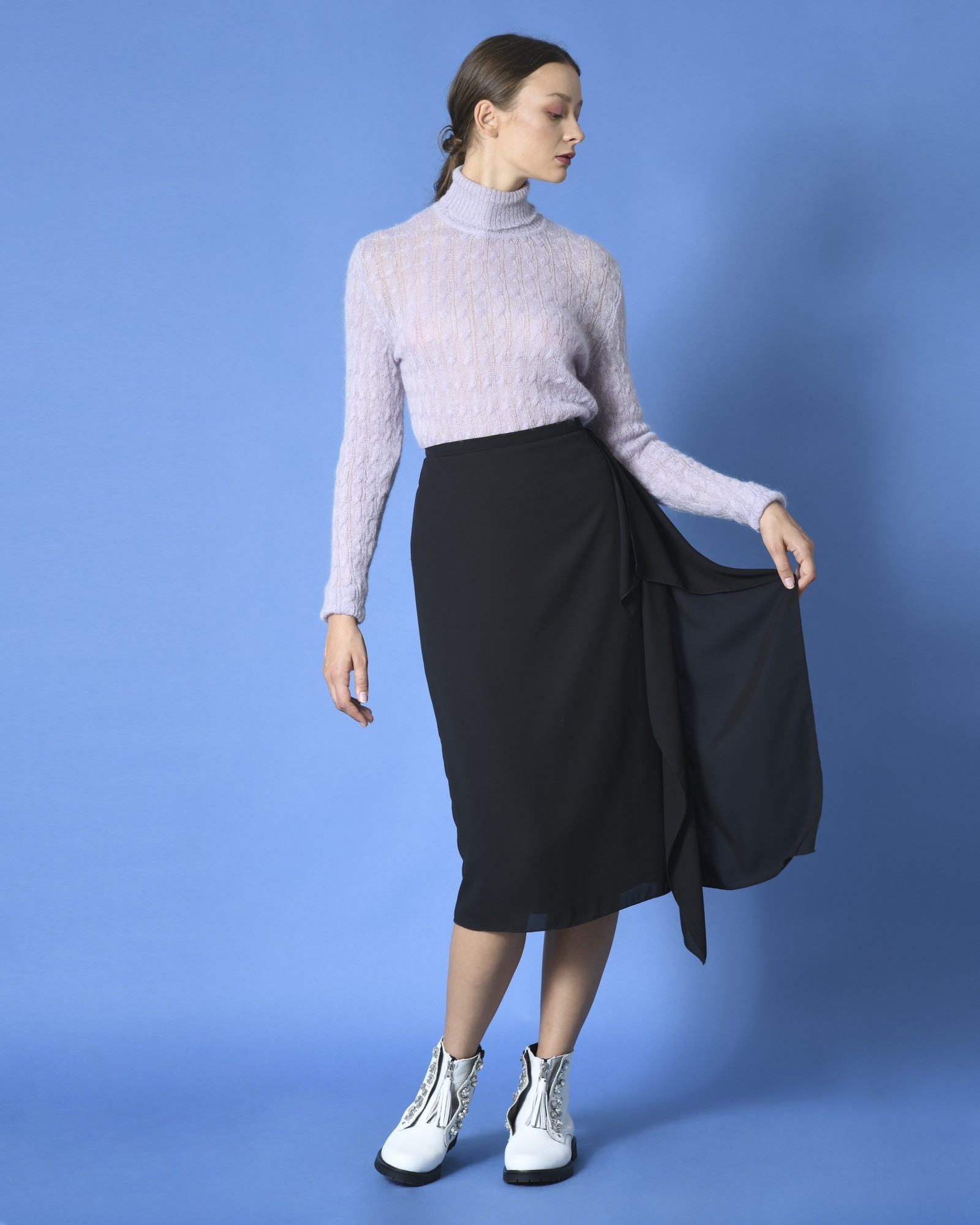 - Détail : taille haute, longueur genoux, volant sur le côté gauche.