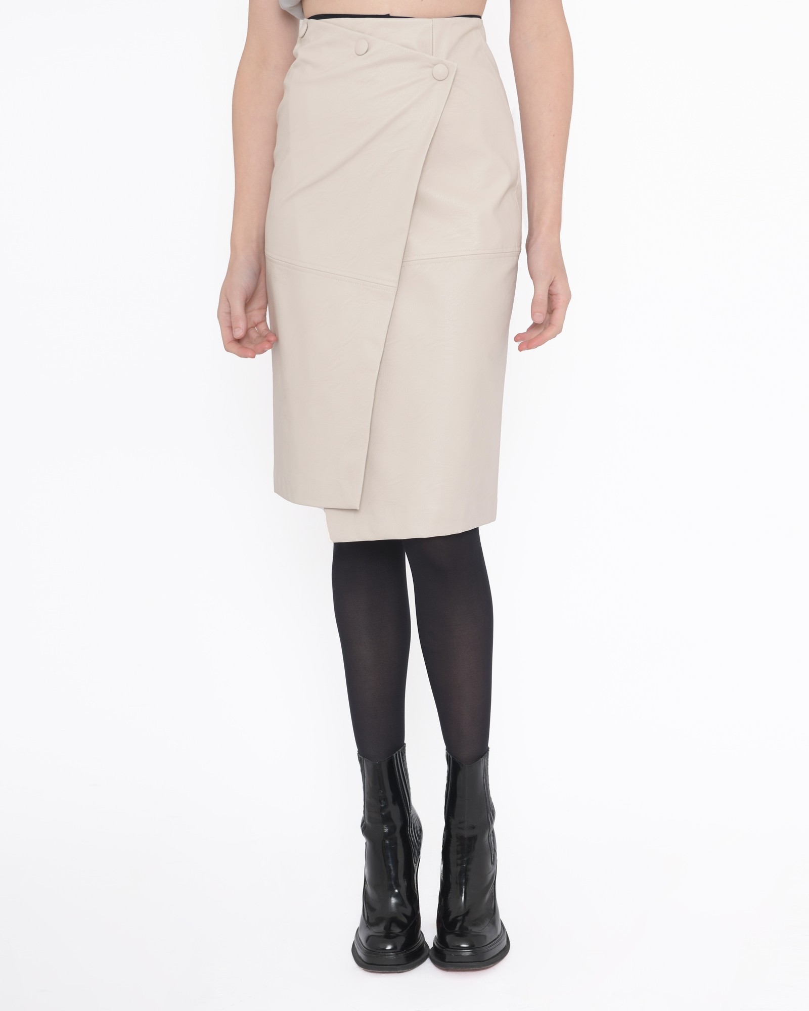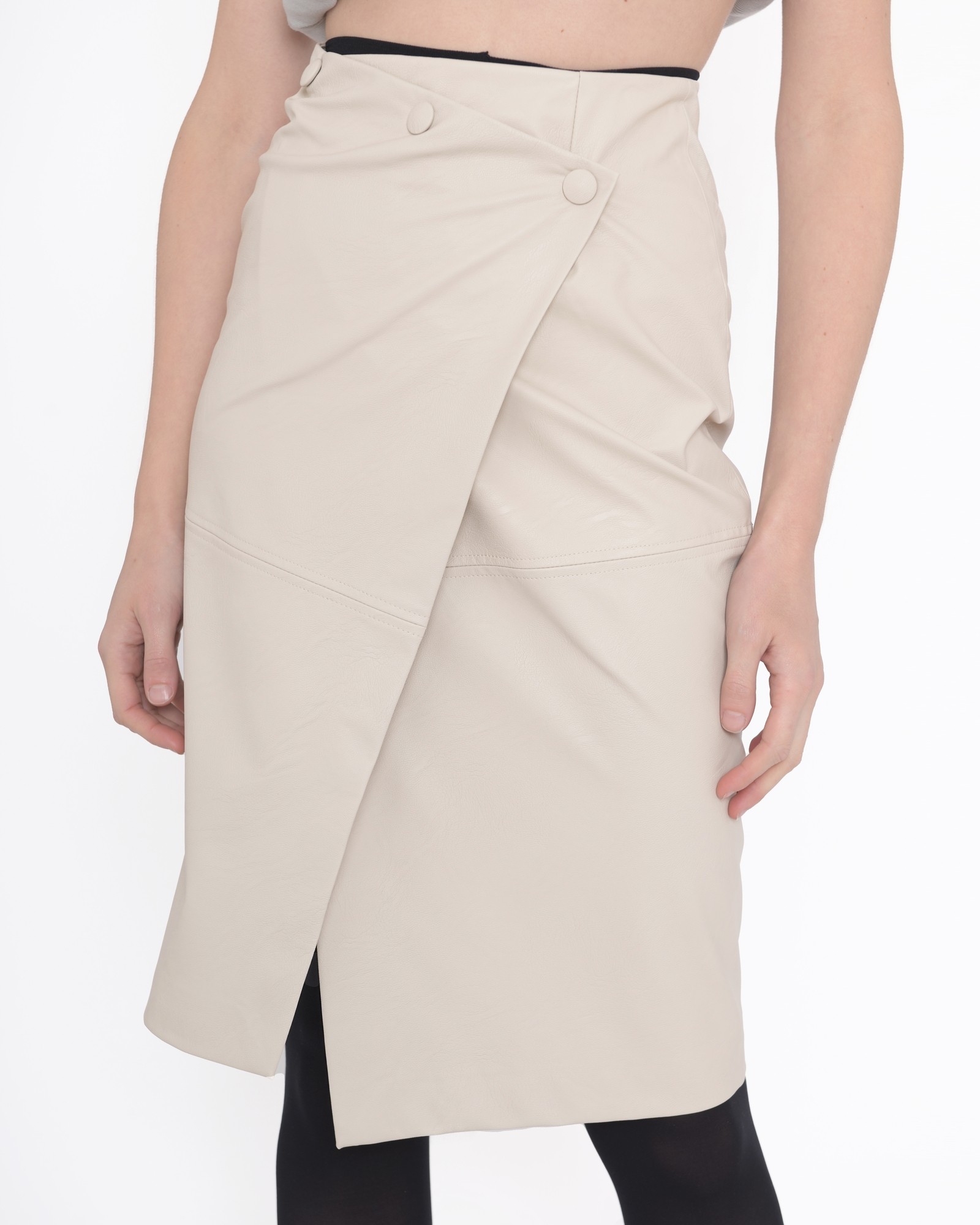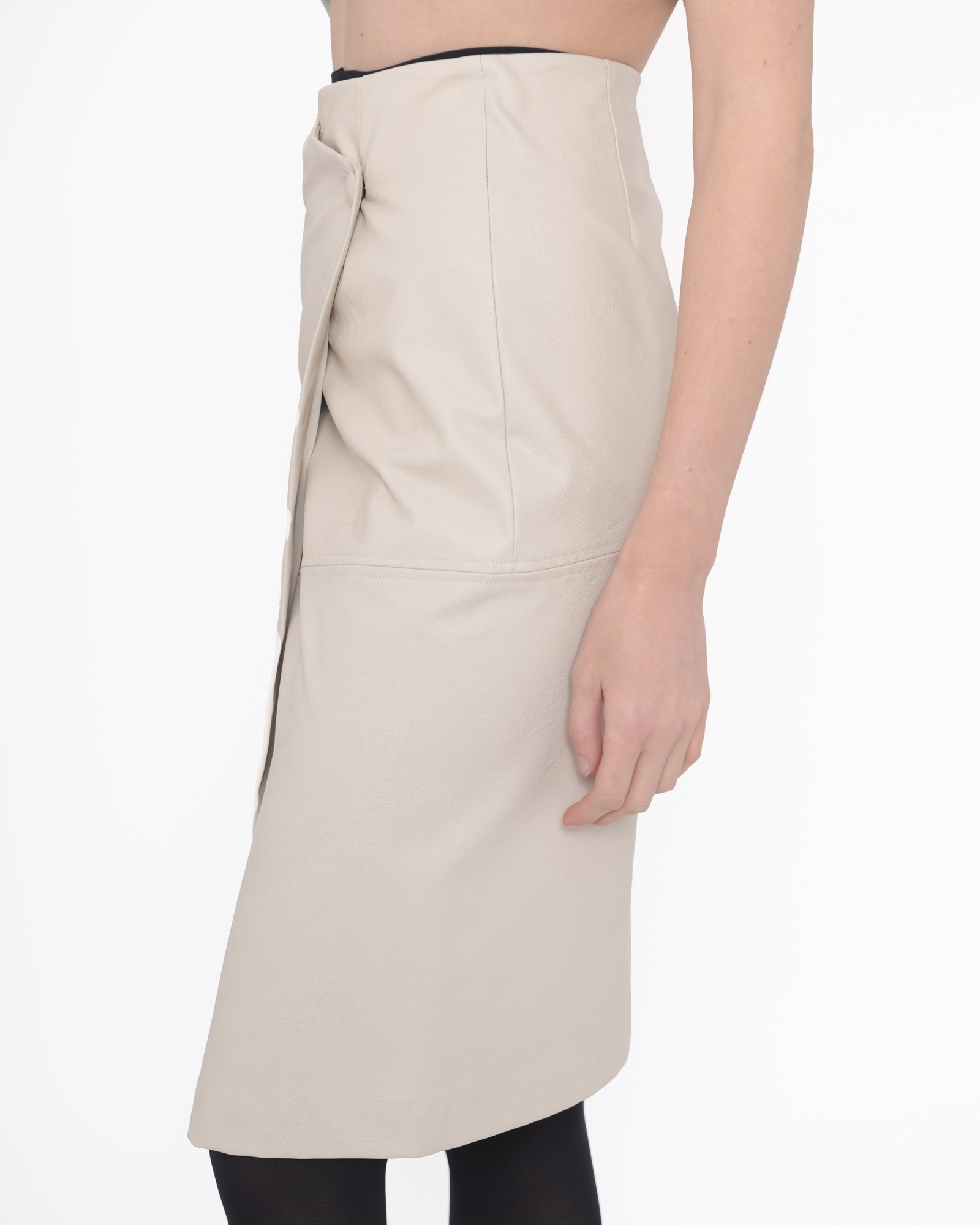 Jupe croisée en cuir Nude. Détails: Jupe croisée, longueur genoux., Attention ce produit ne contient pas de poches.