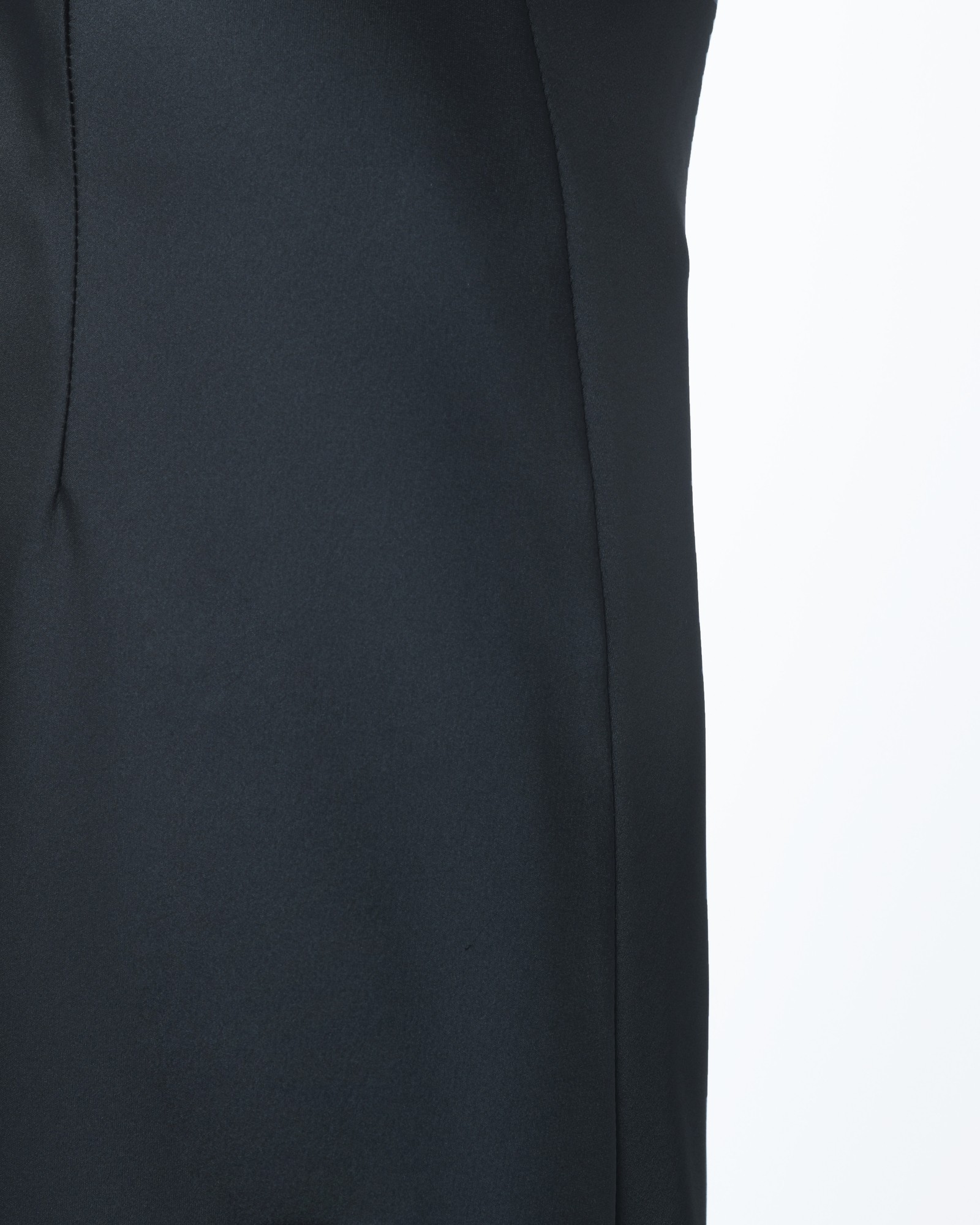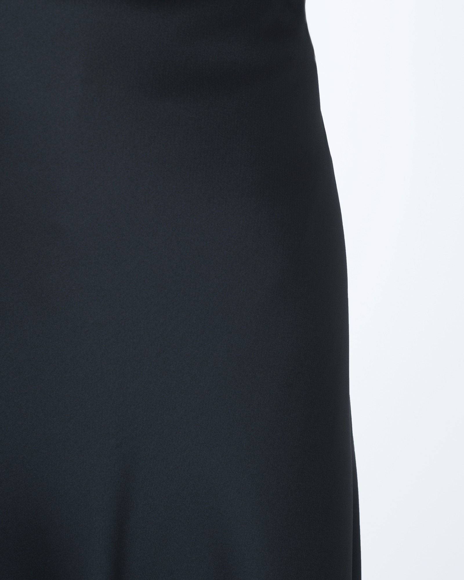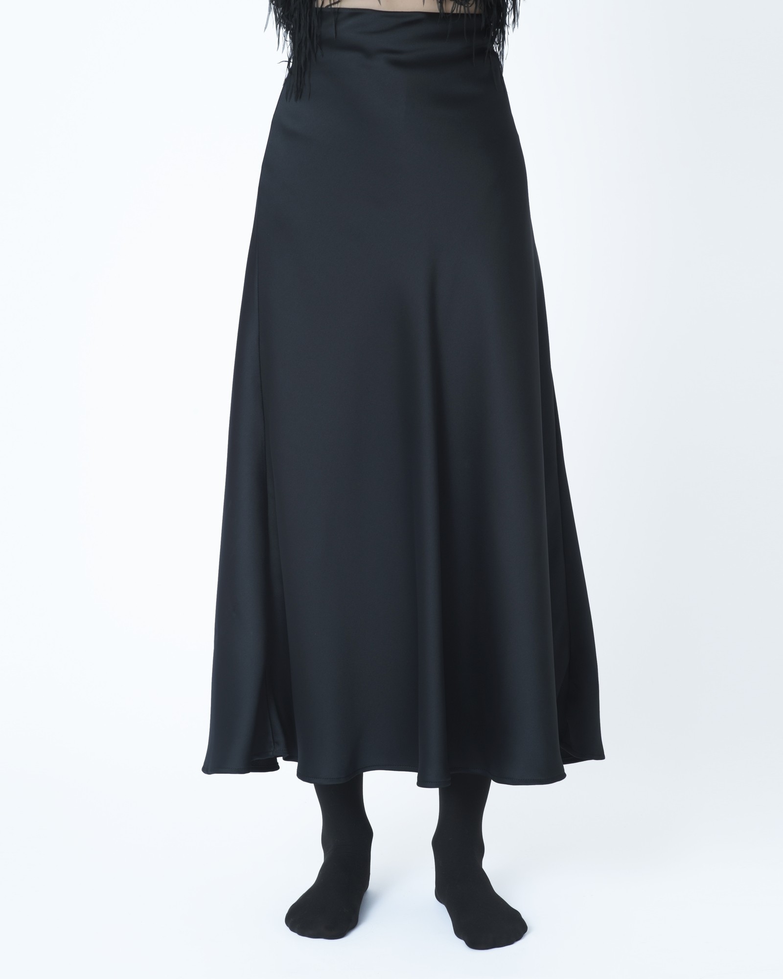 Jupe longue satinée Maesta. Détails: Jupe longue asymétrique, tissu satiné, système de fermeture standard par fermeture à glissière côté gauche.