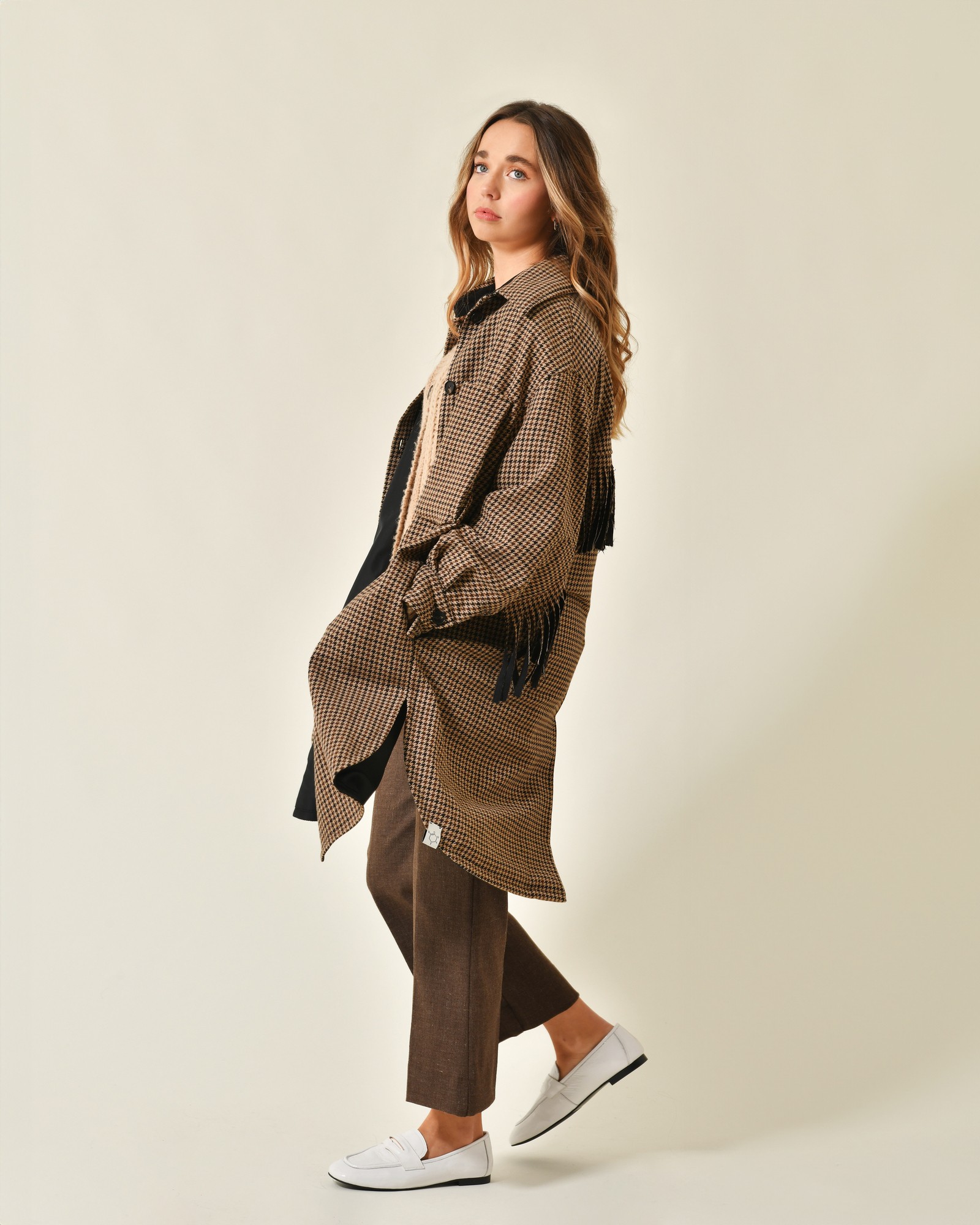 Ce manteau au motif pied-de-poule signé T_Coat se distingue par sa coupe large et sa grande poche avant, offrant à la fois confort et style. Son col large ajoute une touche de caractère, tandis que les franges disposées à l'arrière et le long des manches apportent une originalité unique à la pièce.