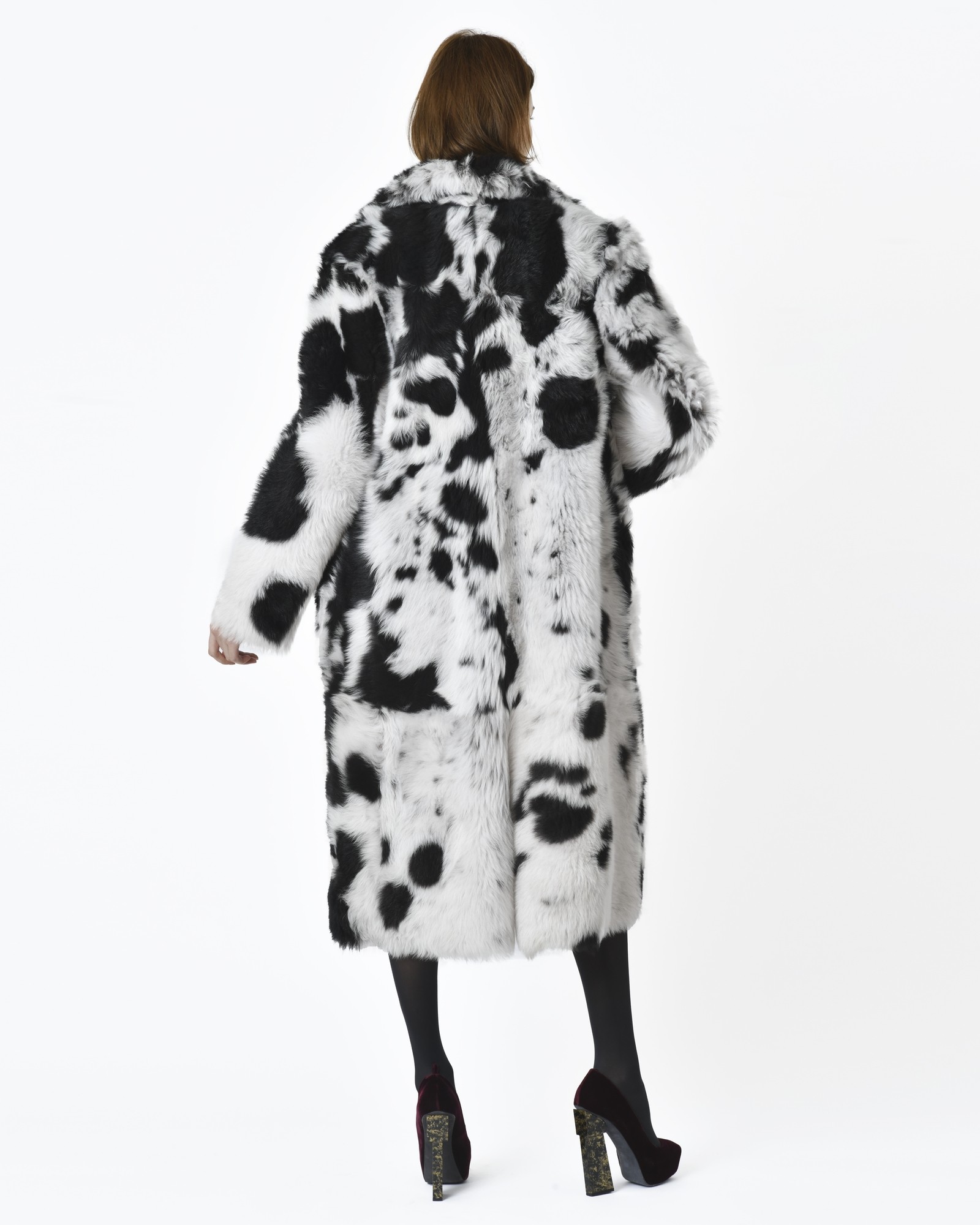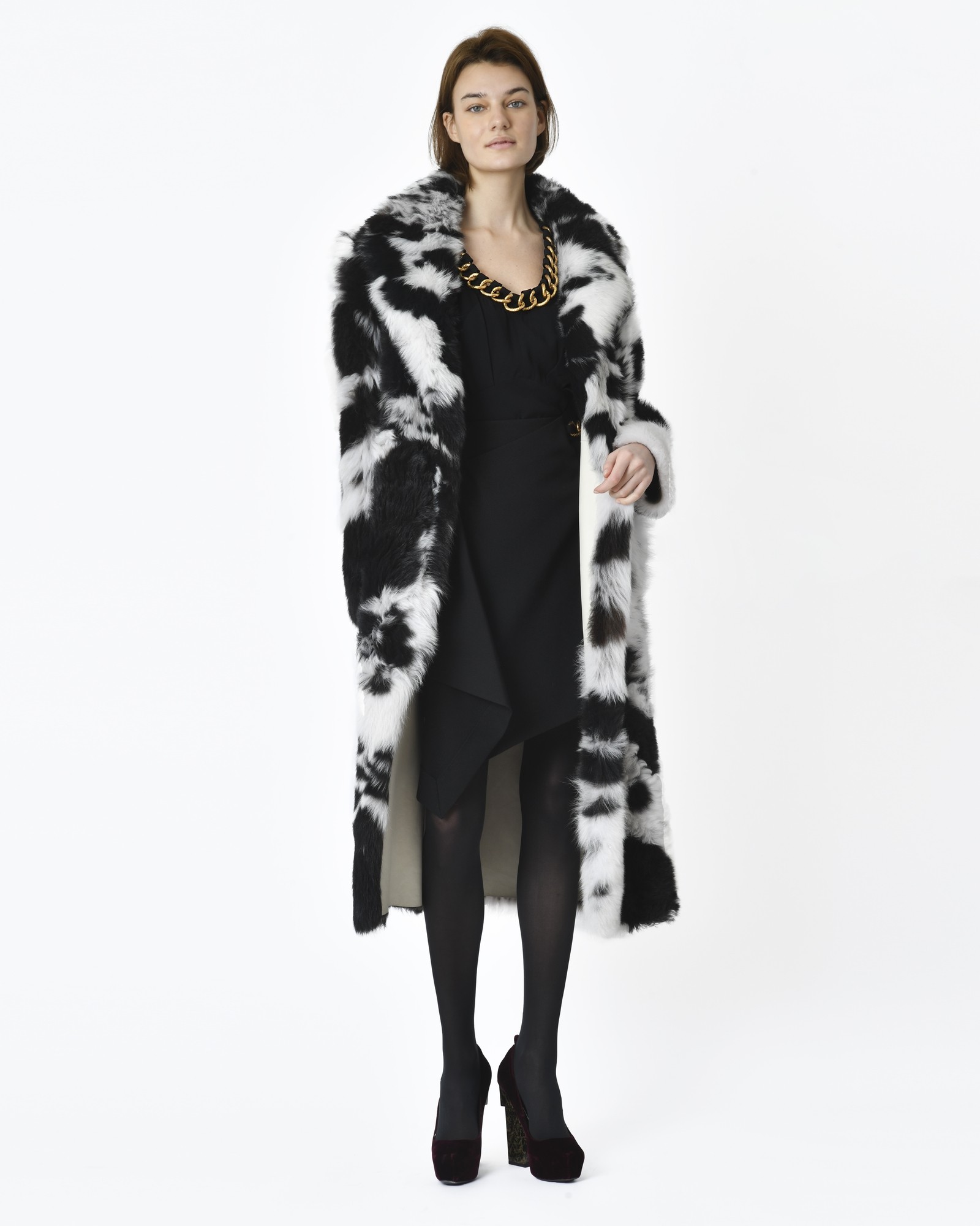 Manteau en fourrure black and white: Détails: Manteau en cuir de vache et de bélier, manches longues, col tailleur, poches cotées, fermeture via bouton pression milieu devant fente dans le dos.