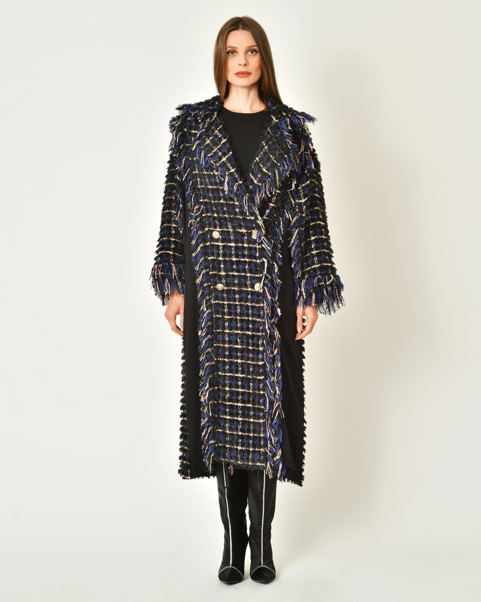 Ce manteau en tweed à carreaux est un choix chic pour affronter le froid avec style. Son design sophistiqué est rehaussé par des franges qui ajoutent une touche de texture et de mouvement. Les applications en tissu doublé sur les côtés apportent une note contemporaine à cette pièce. Un incontournable de la garde-robe pour un look élégant et original.