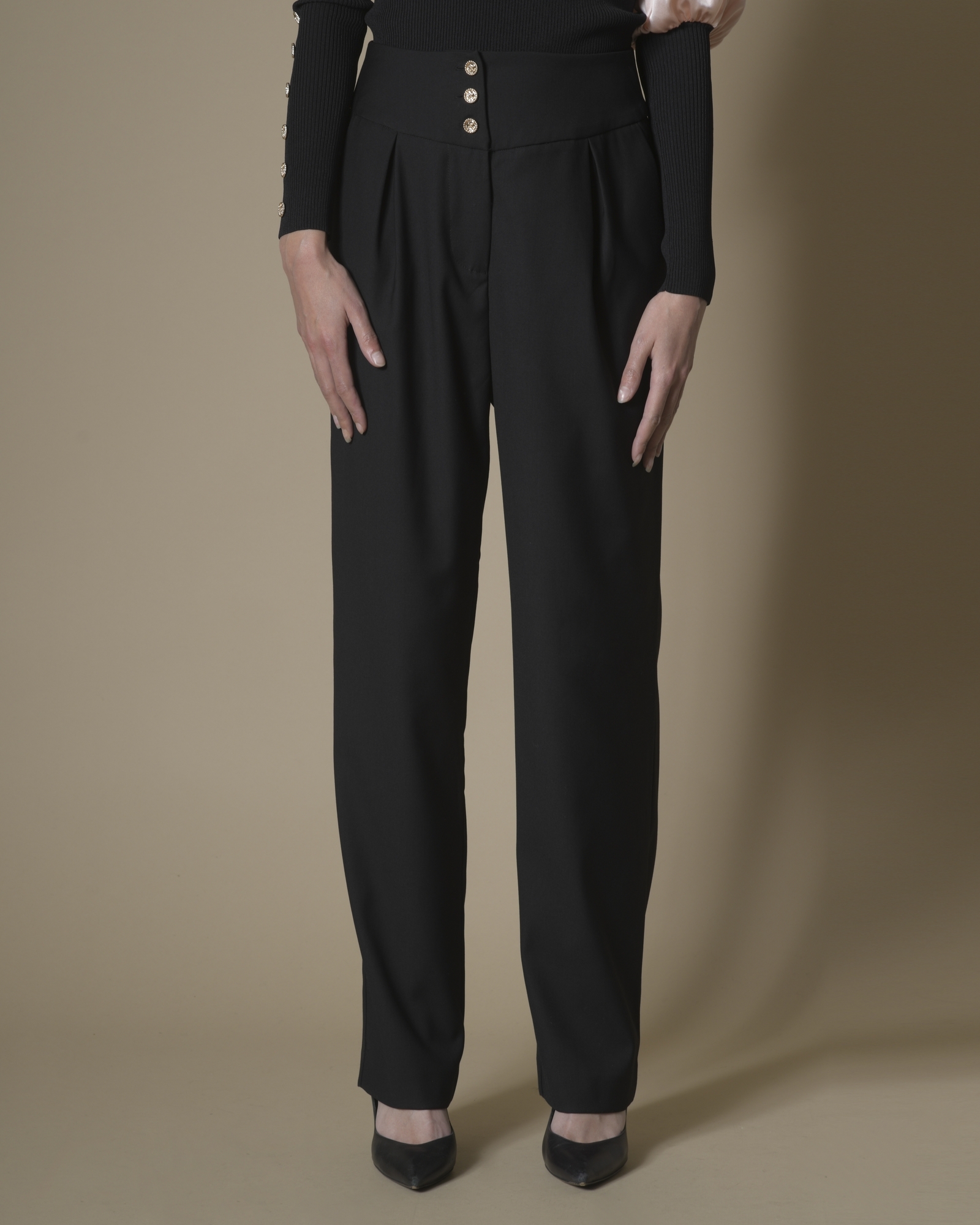 Ce pantalon carotte taille haute à 3 boutons et fermeture à glissière, possède également des surpiqûres qui lui donnent encore plus de caractère et de chic.