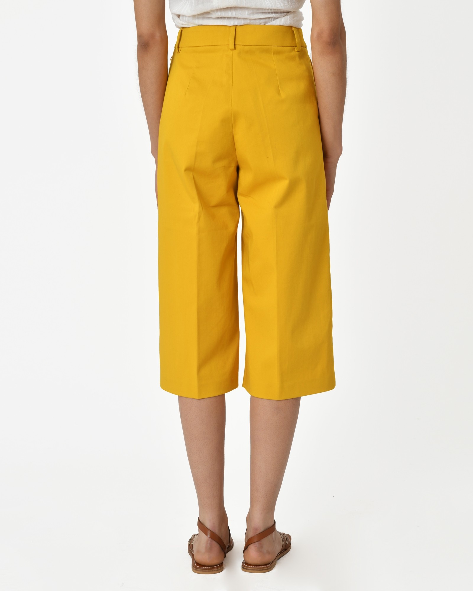 Pantalon jaune Borbonese : Détails: Pantalon jupe culotte 3/4, jaune, passants à la ceinture, poches italiennes, fermeture éclair et bouton milieu devant.