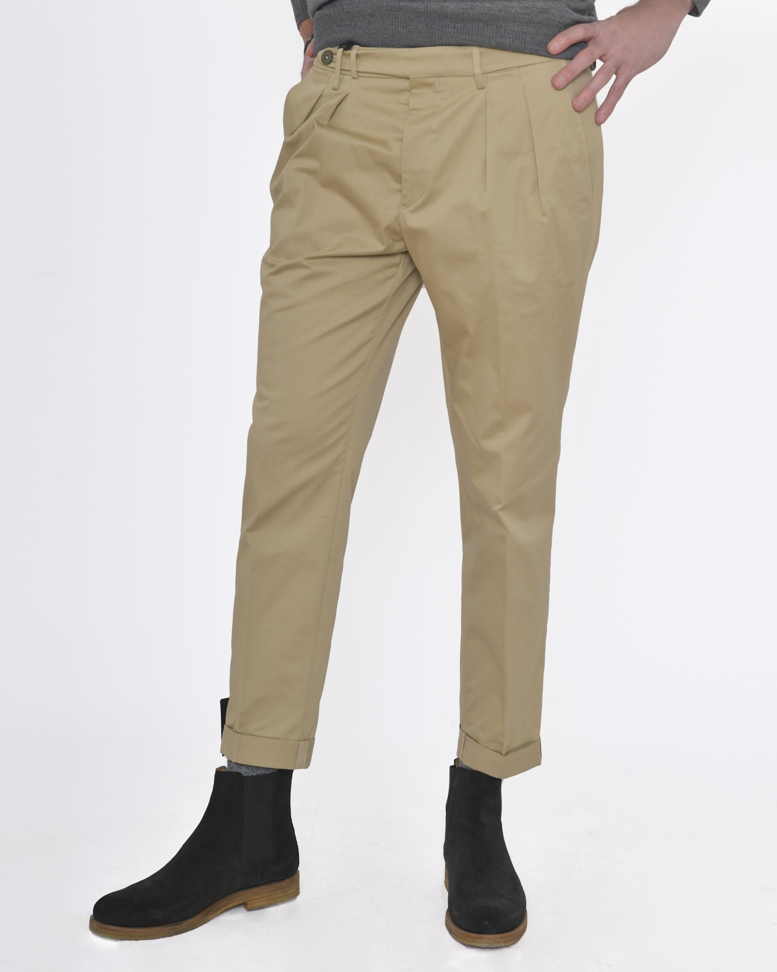 Pantalon beige Michael Coal. Détails: Pantalon ajusté, pinces devant, poche à l’italienne sur le devant, poches double passepoilées à rabat sur le dos avec boutons, fermeture éclair sur le milieu devant avec détails boutons milieu côté droit.