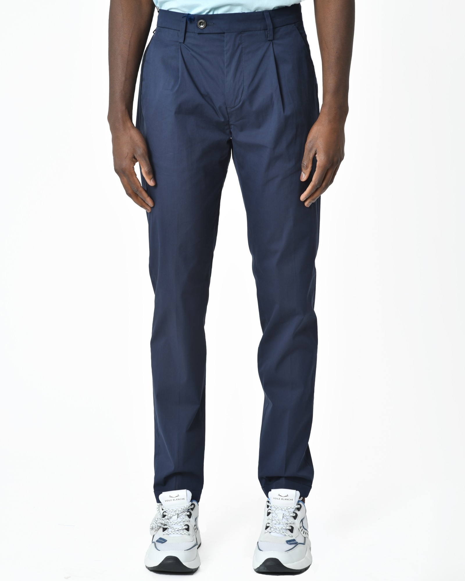 Pantalon bleu marine Rodrigo. Détails: Pantalon bleu marine, double passepoilée dans le dos, passants à la ceinture, fermeture éclair et bouton milieu devant.