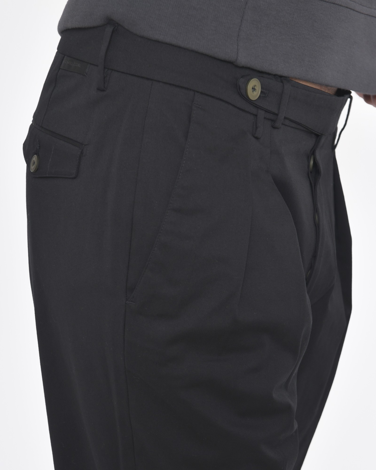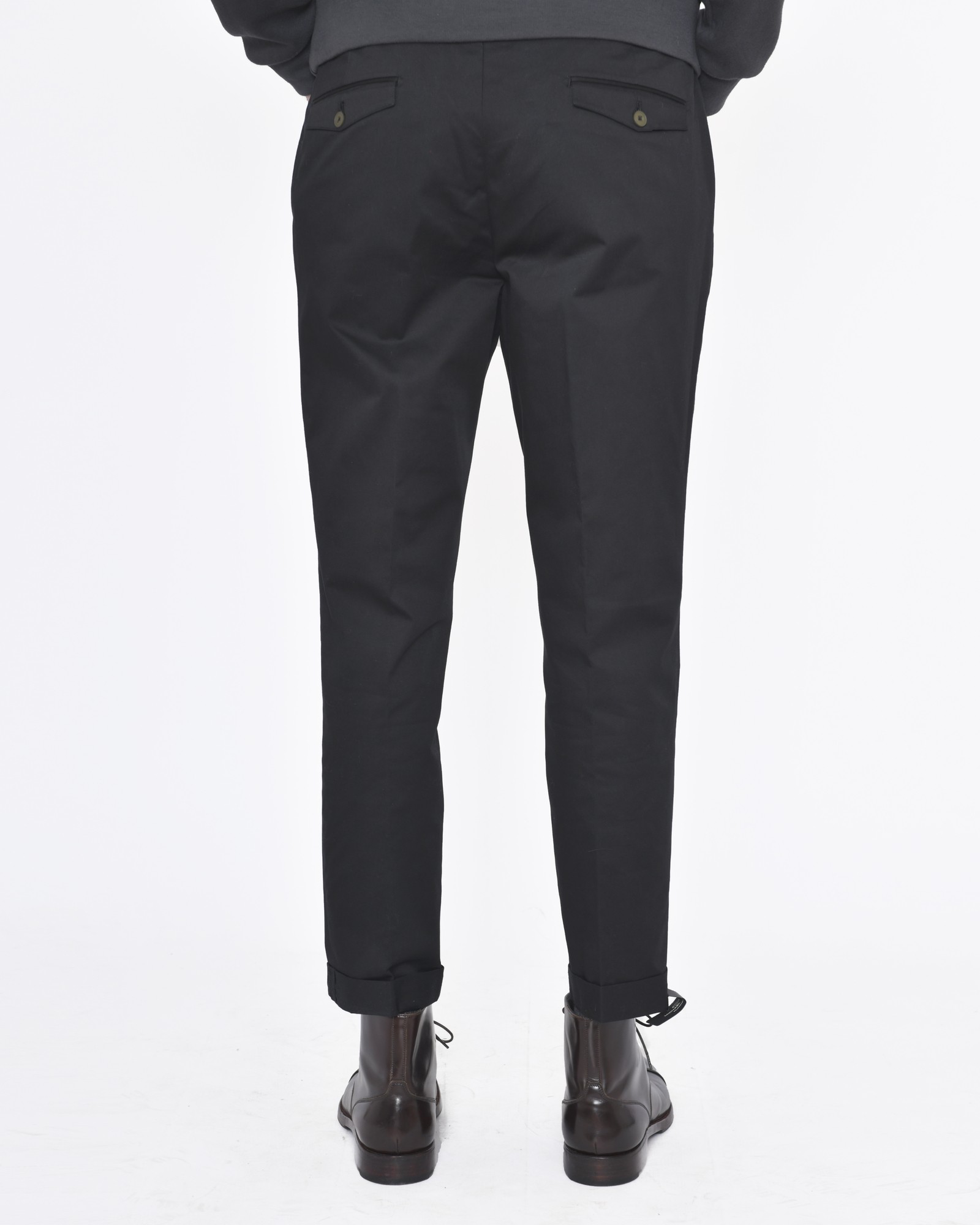 Pantalon noir Michael Coal. Détails: Pantalon ajusté, pinces devant, poche à l’italienne sur le devant, poches double passepoilées à rabat sur le dos avec boutons, fermeture éclair sur le milieu devant avec détails boutons milieu côté droit.