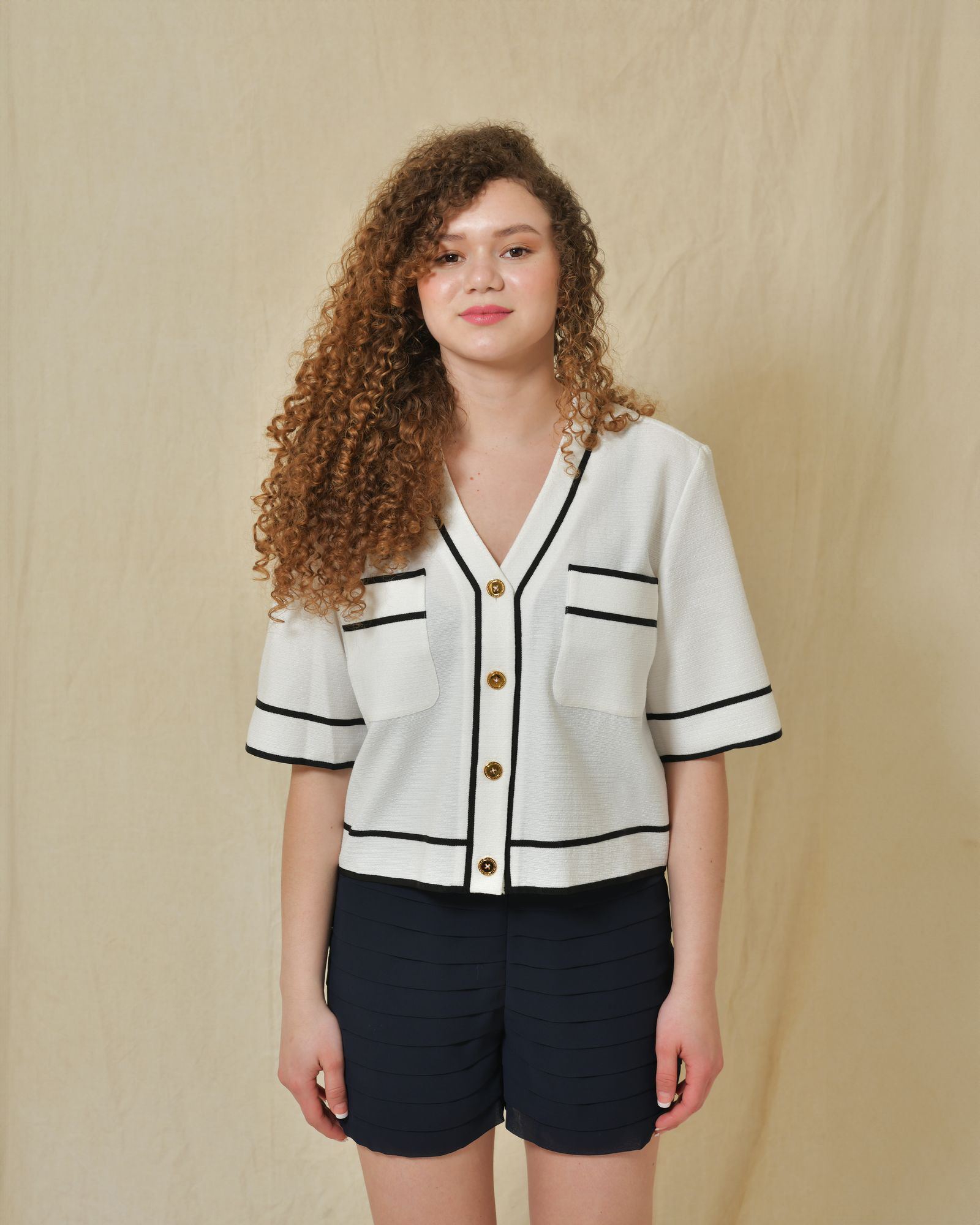 Cardigan à manches courtes Edward Achour, sublimé par ses boutons dorés et ses détails noirs. Il possède deux poches sur le devant, ajoutant une touche pratique et élégante.