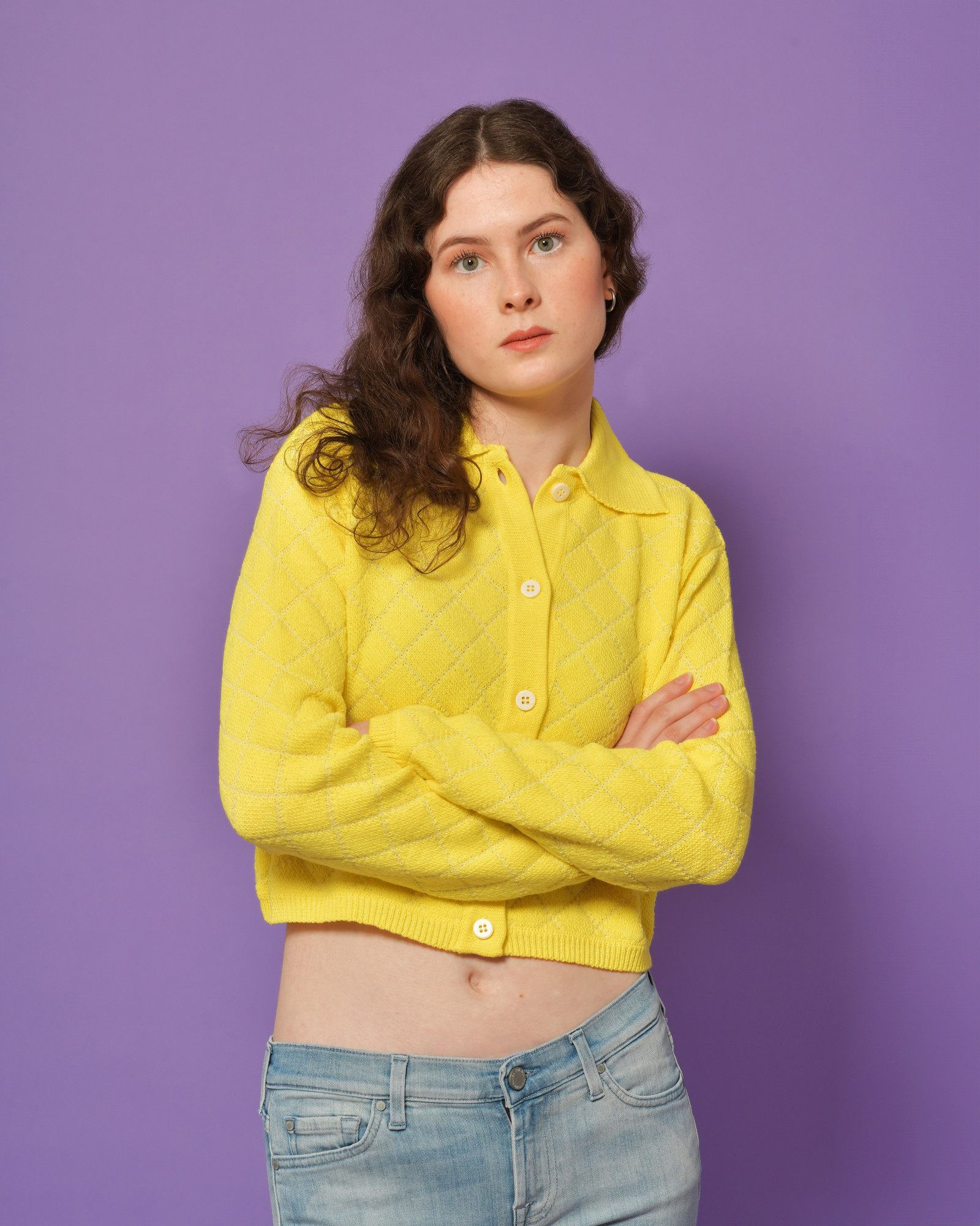Ce cardigan en coton jaune signé AVN apporte une touche lumineuse et graphique à votre vestiaire. Il se distingue par son col classique orné de boutons blancs contrastés et ses bordures côtelées fines qui structurent la silhouette. Un essentiel moderne et audacieux, parfait pour dynamiser un look de saison avec style.