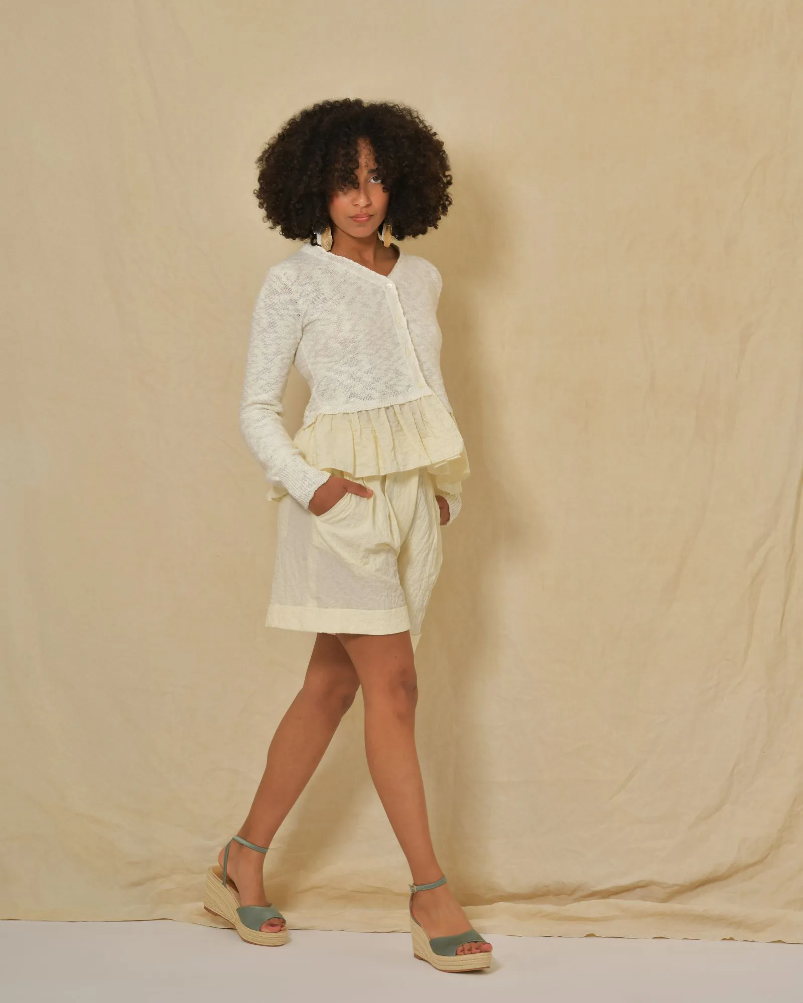 Ce sublime cardigan en maille AVN séduit par son élégance et son raffinement. Son bas volanté en coton texturé apporte une touche féminine, tandis que son col en V délicat et ses manches côtelées assurent une finition sophistiquée. Une pièce unique pour un style chic et moderne.
