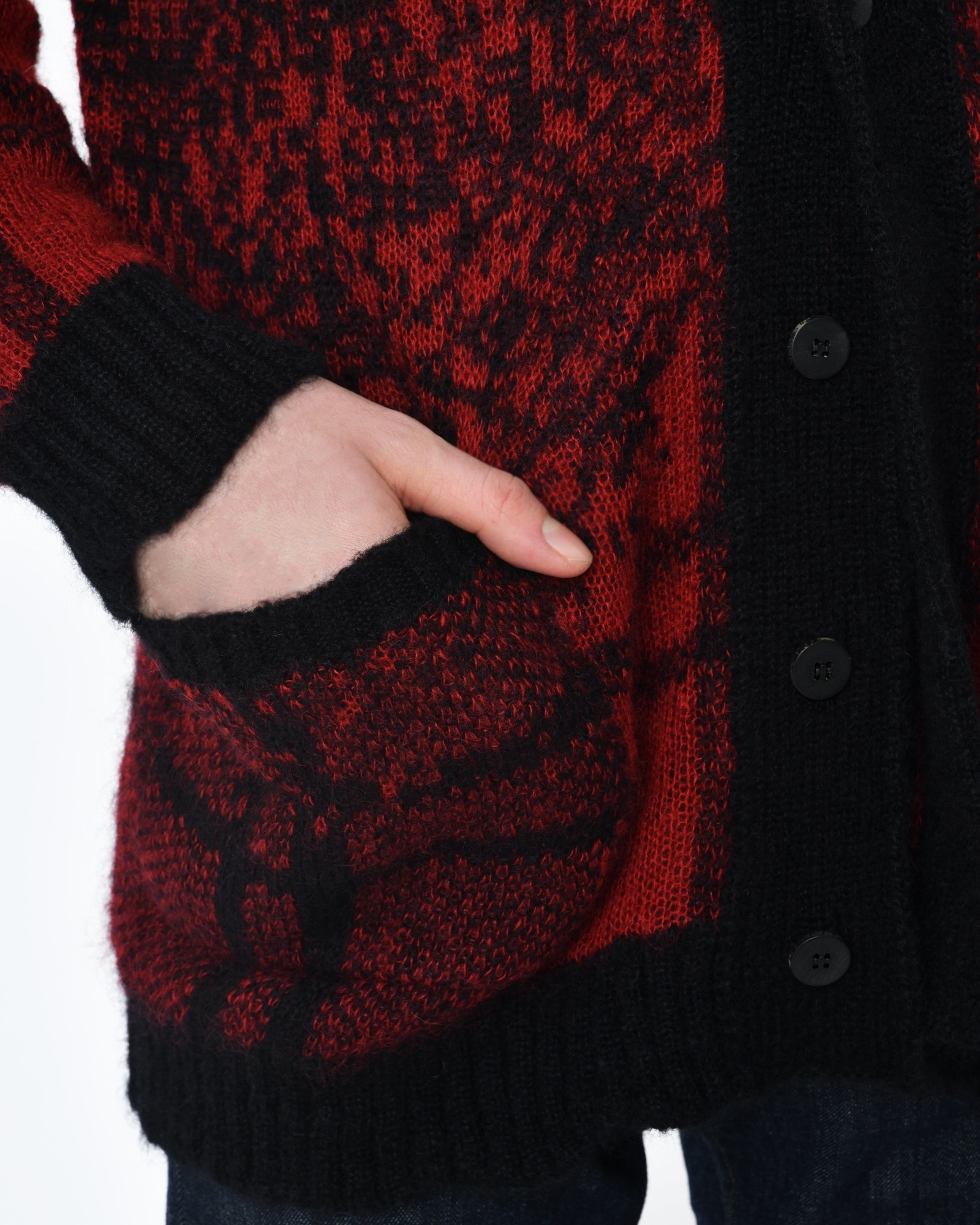 Réalisé dans un mélange de mohair duveteux, ce cardigan noir est doté de carreaux partielle qui disparait au long du cardigan.