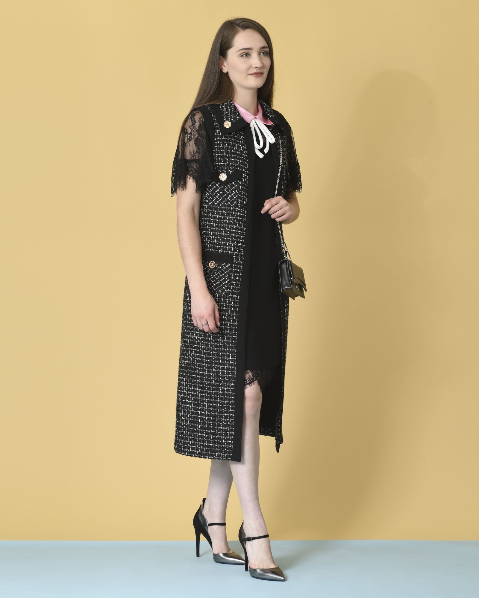 Cette robe est inspirée des silhouettes féminines des années 50, elle est dotée d' empiècements en dentelle fleurie et d’un col claudine avec nœud.