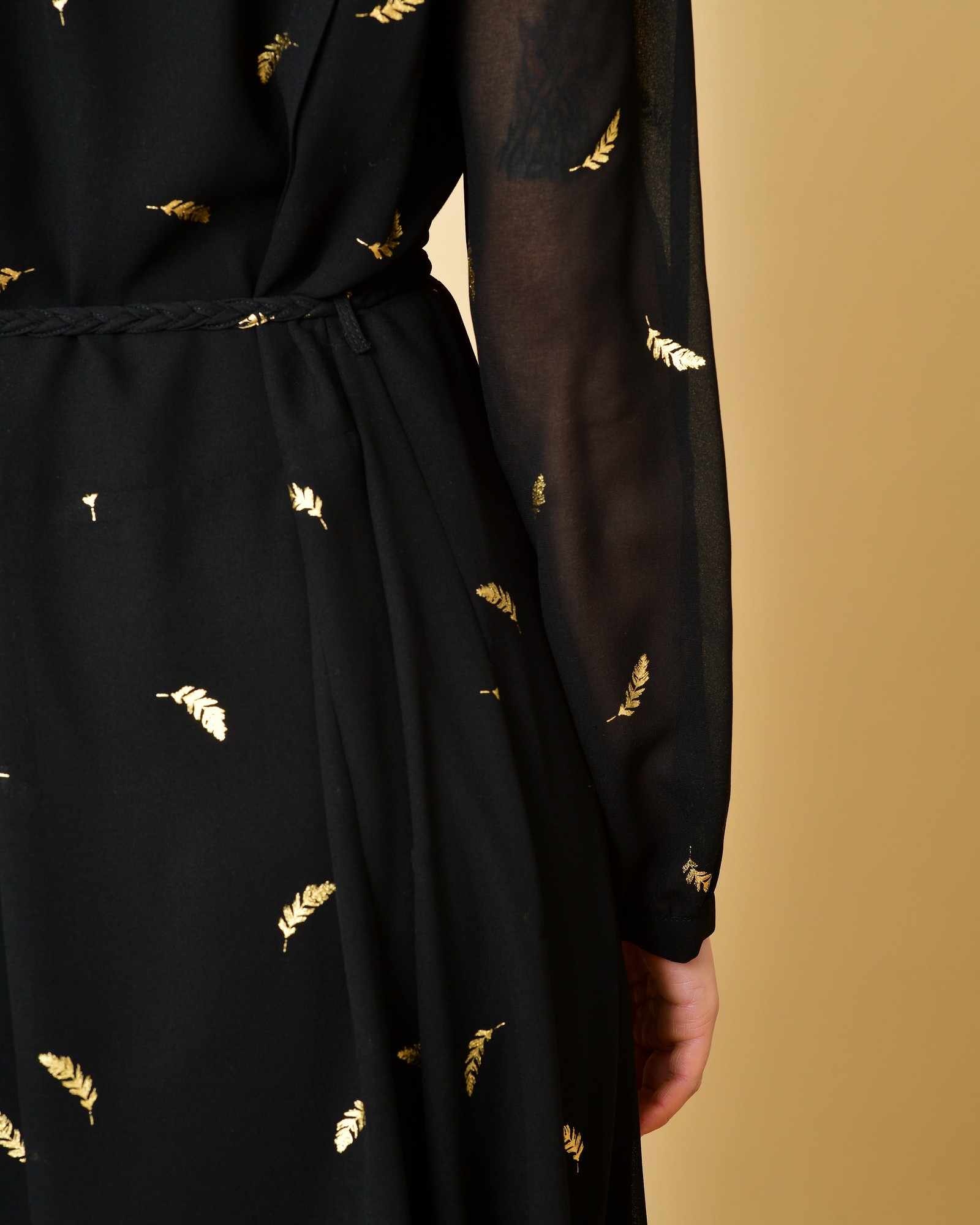 Sublimez votre élégance avec cette longue robe de Chemins Blancs. Confectionnée dans un tissu fin légèrement transparent, cette robe est entièrement imprimée de délicates plumes dorées. Les détails raffinés, comme les plissés délicats et les volants sur le devant, ajoutent une touche de sophistication. Accentuez votre silhouette avec la ceinture tressée incluse, ou optez pour un style plus décontracté en la portant libre.