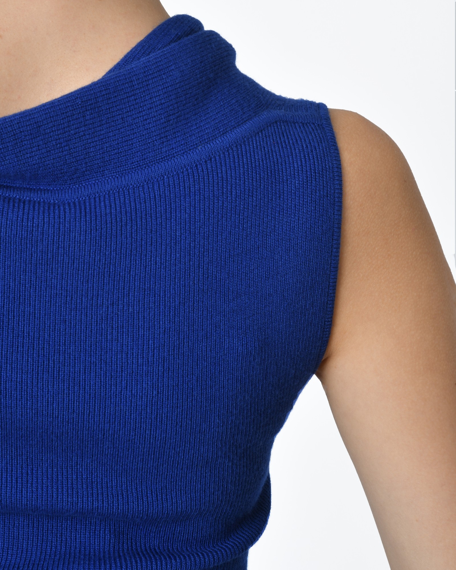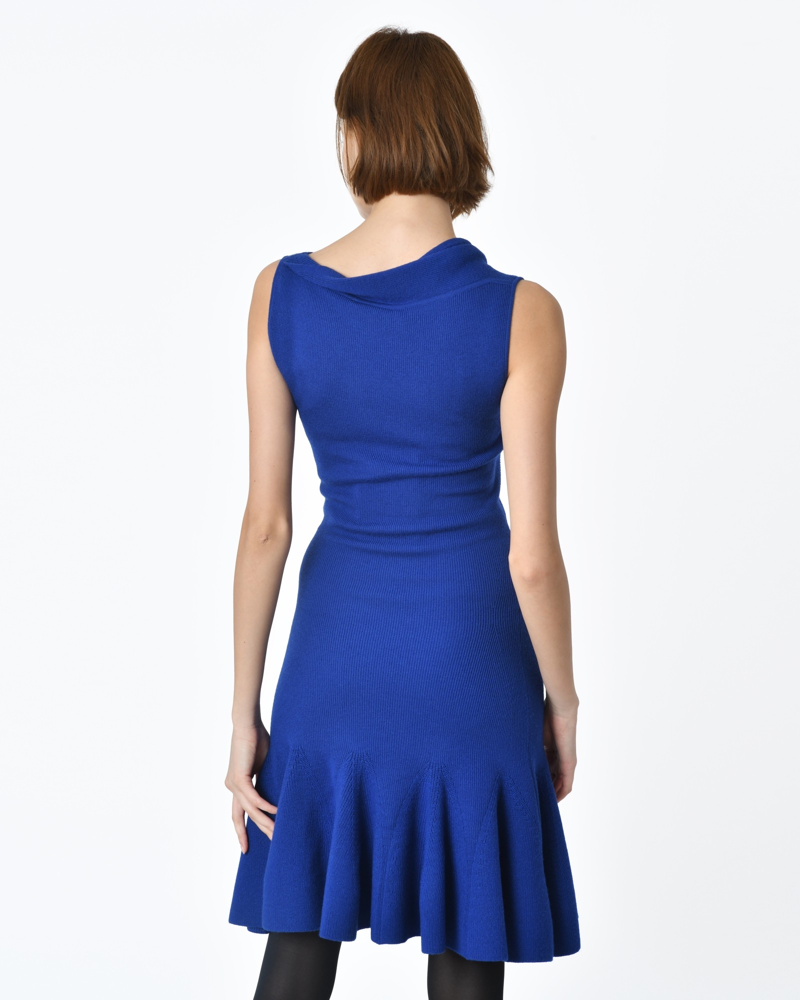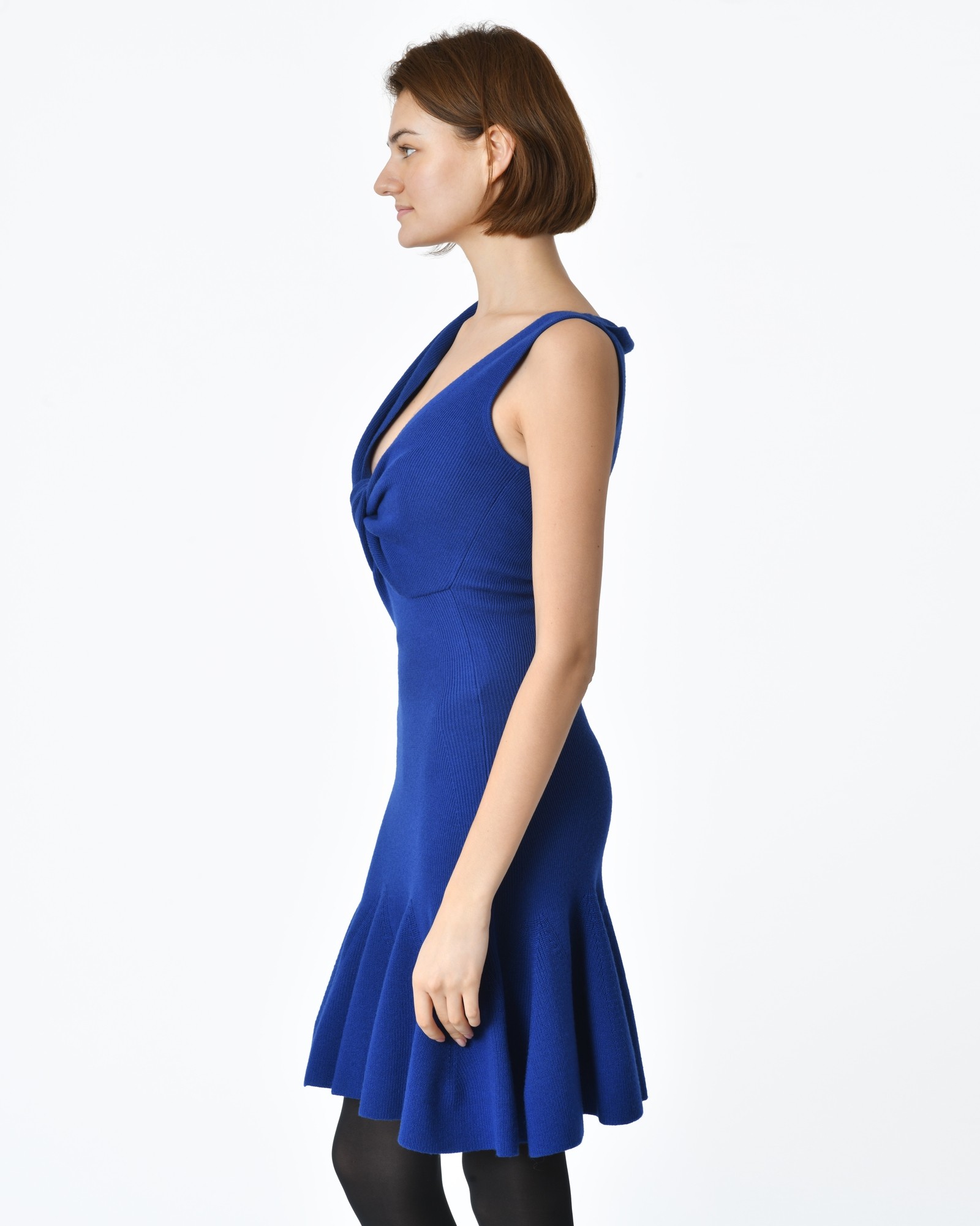 Robe bleue roi Alexander McQueen: Détails: Robe sans manches, bleu roi en maille semi-épaisse, des godets réguliers sur le bas de la robe, décolleté effet cache-cœur, dans le dos col châle