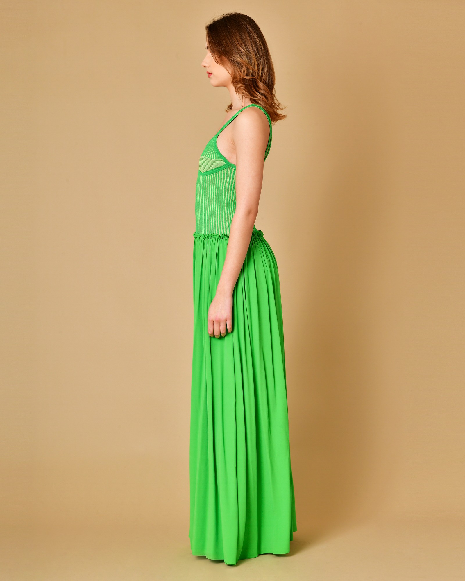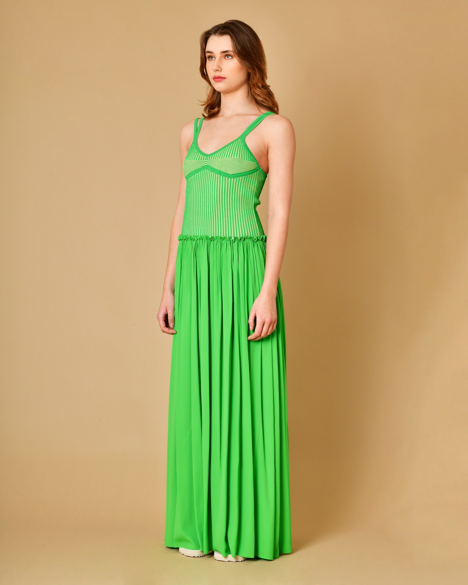 Découvrez notre robe en maille élégante à deux fines bretelles de Beatrice B, parfaite pour les journées ensoleillées. Sa jupe plissée maxi apporte une fluidité et une légèreté remarquables à votre silhouette. Parfaite pour un look chic et décontracté lors des occasions estivales.