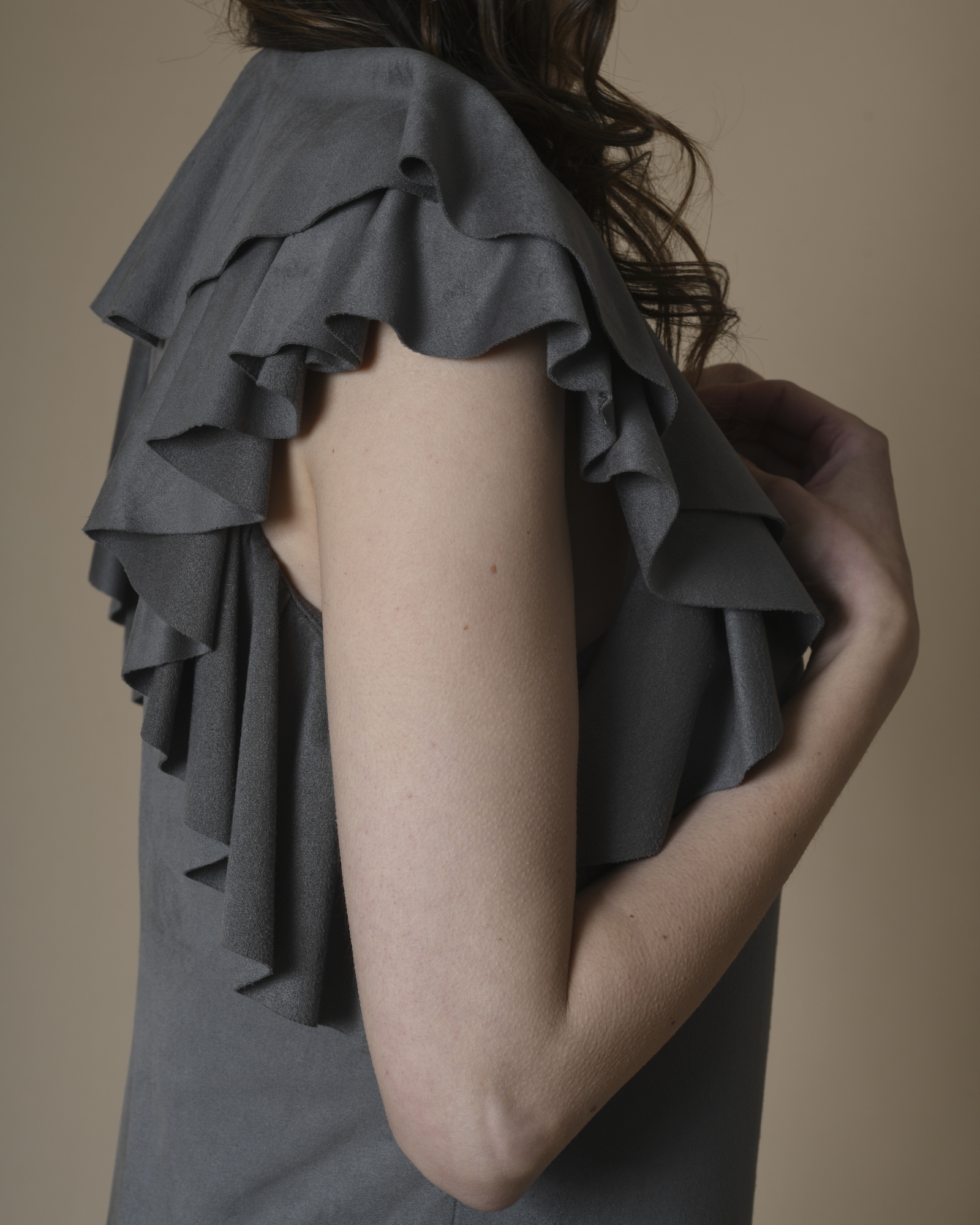 Jijil impose encore une fois son originalité avec cette robe suédine à manches et col volantés, douce et délicate, elle est agréable à porter de part sa légèreté inégalable.