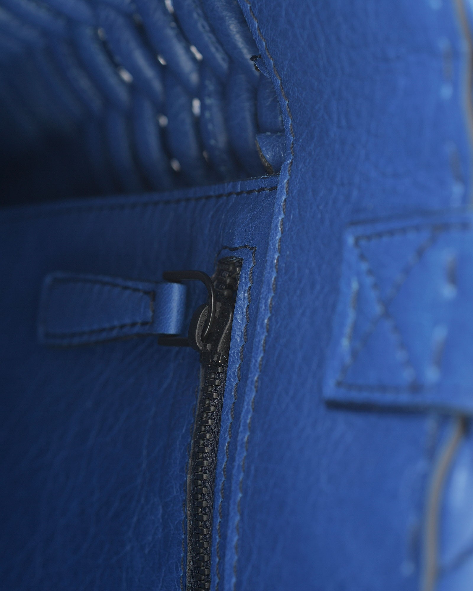 Le sac à main Falorni, confectionné en Italie, dévoile un artisanat exceptionnel avec ses bandes de cuir soigneusement tressées, créant ainsi l'effet d'un panier élégant.