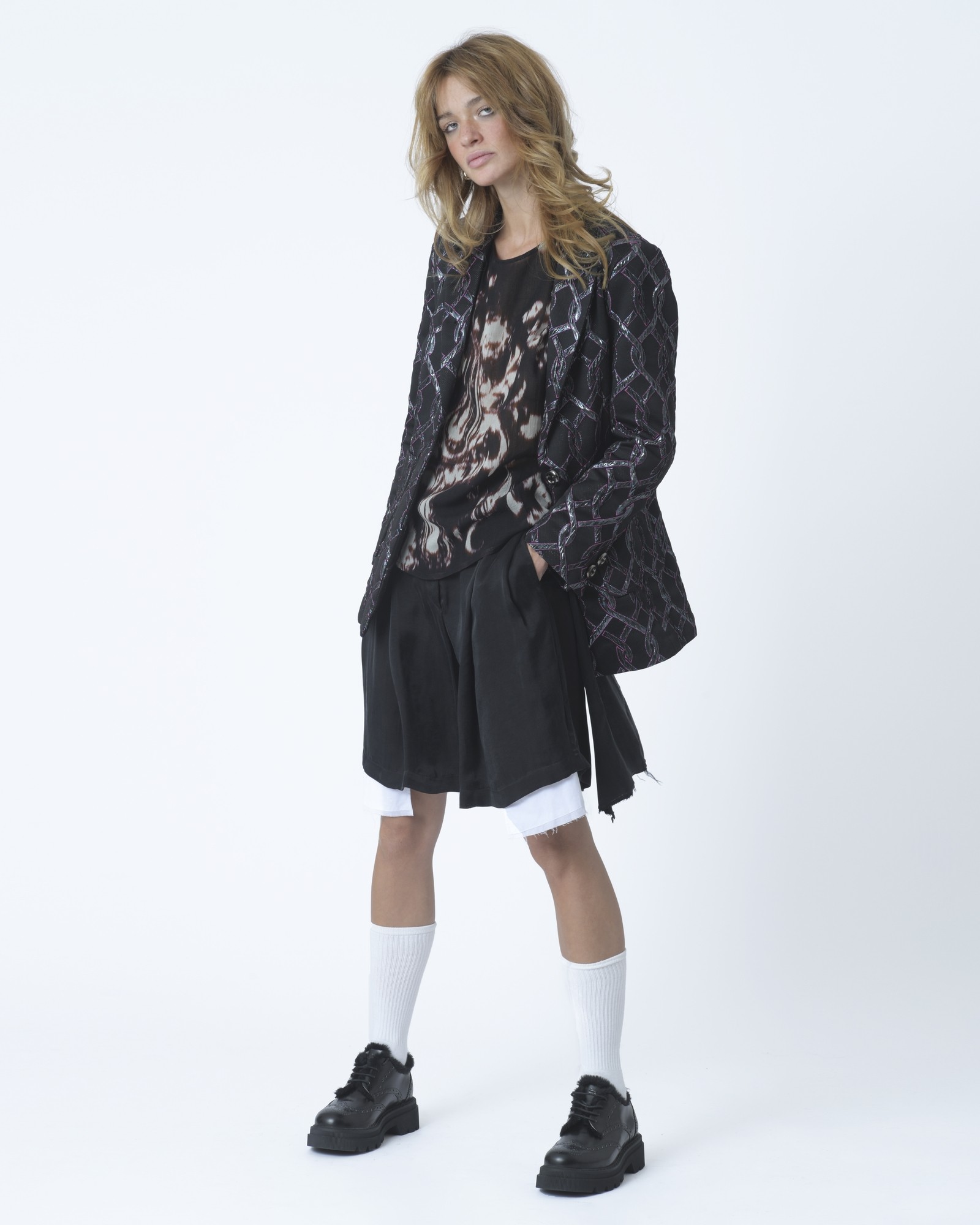 Bermuda en coton Maison flâneur. Détails: tissu satiné, système de fermeture standard: glissière/bouton, poches passepoilées derrière, doublure contrastée blanche asymétrique bas de produit.