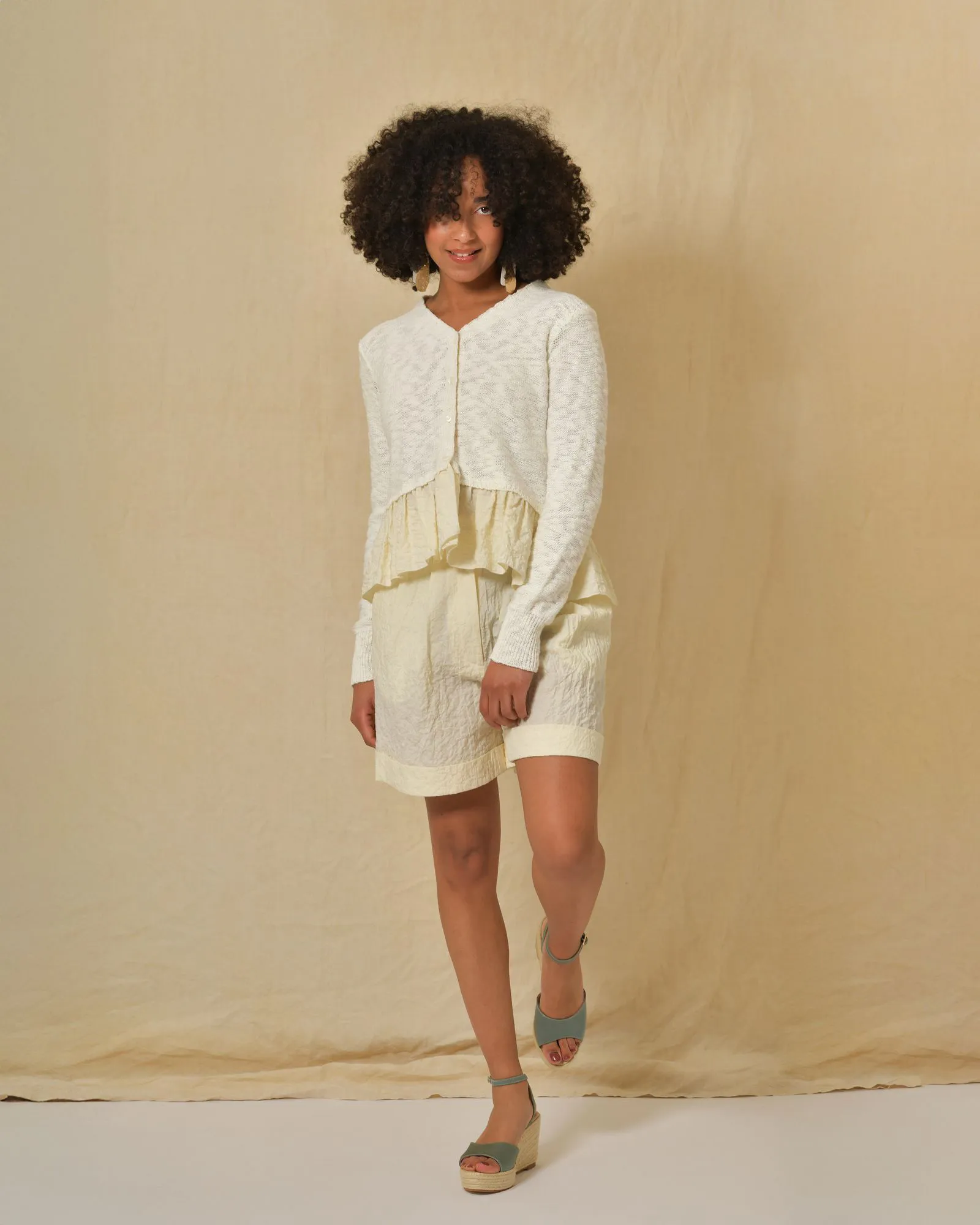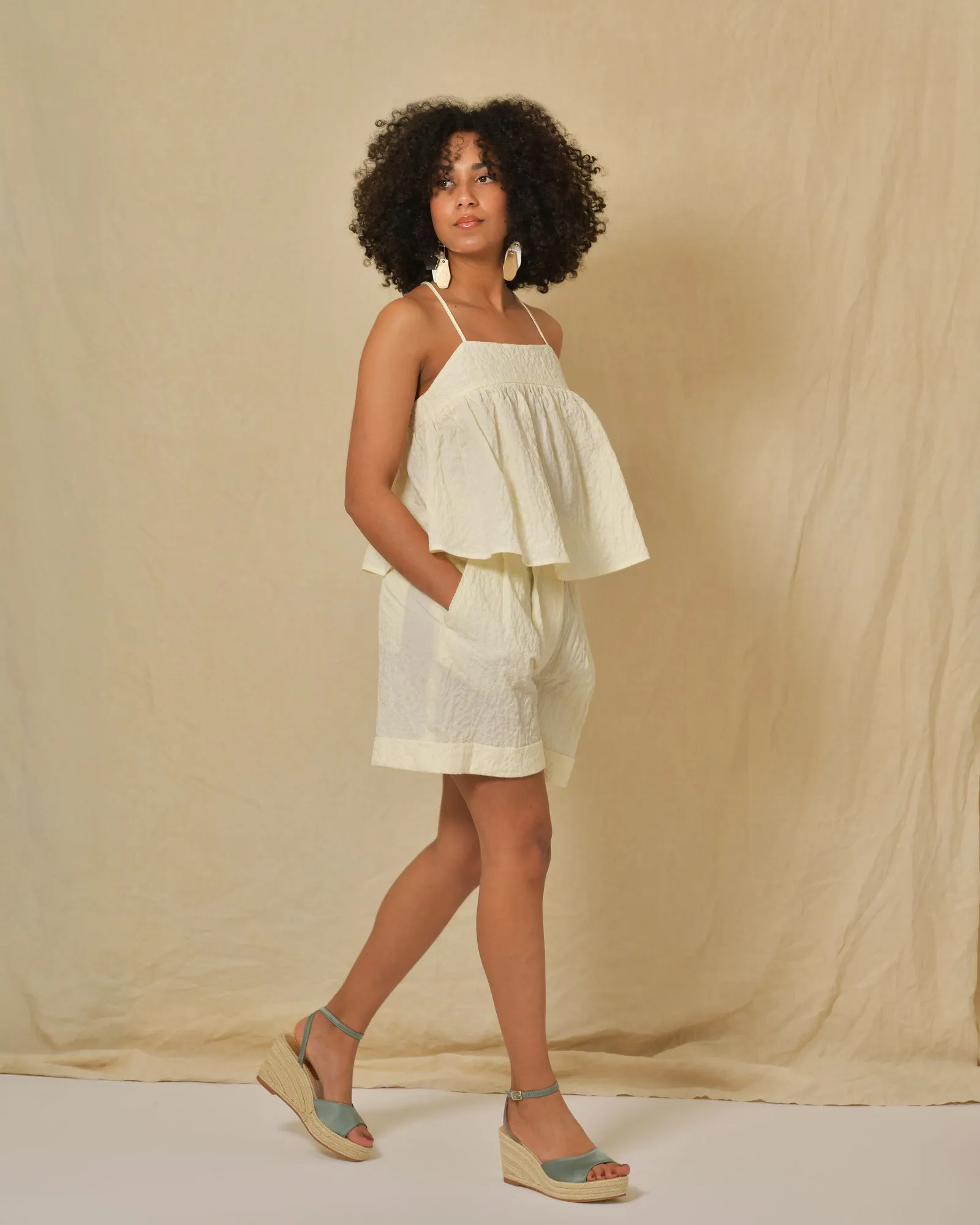 Élégant et structuré, ce short en coton texturé beige signé AVN se distingue par ses deux pinces de chaque côté, sa taille haute flatteuse et son bouton marron contrasté. Doté de quatre poches fonctionnelles, il allie style et praticité pour un look estival raffiné.
