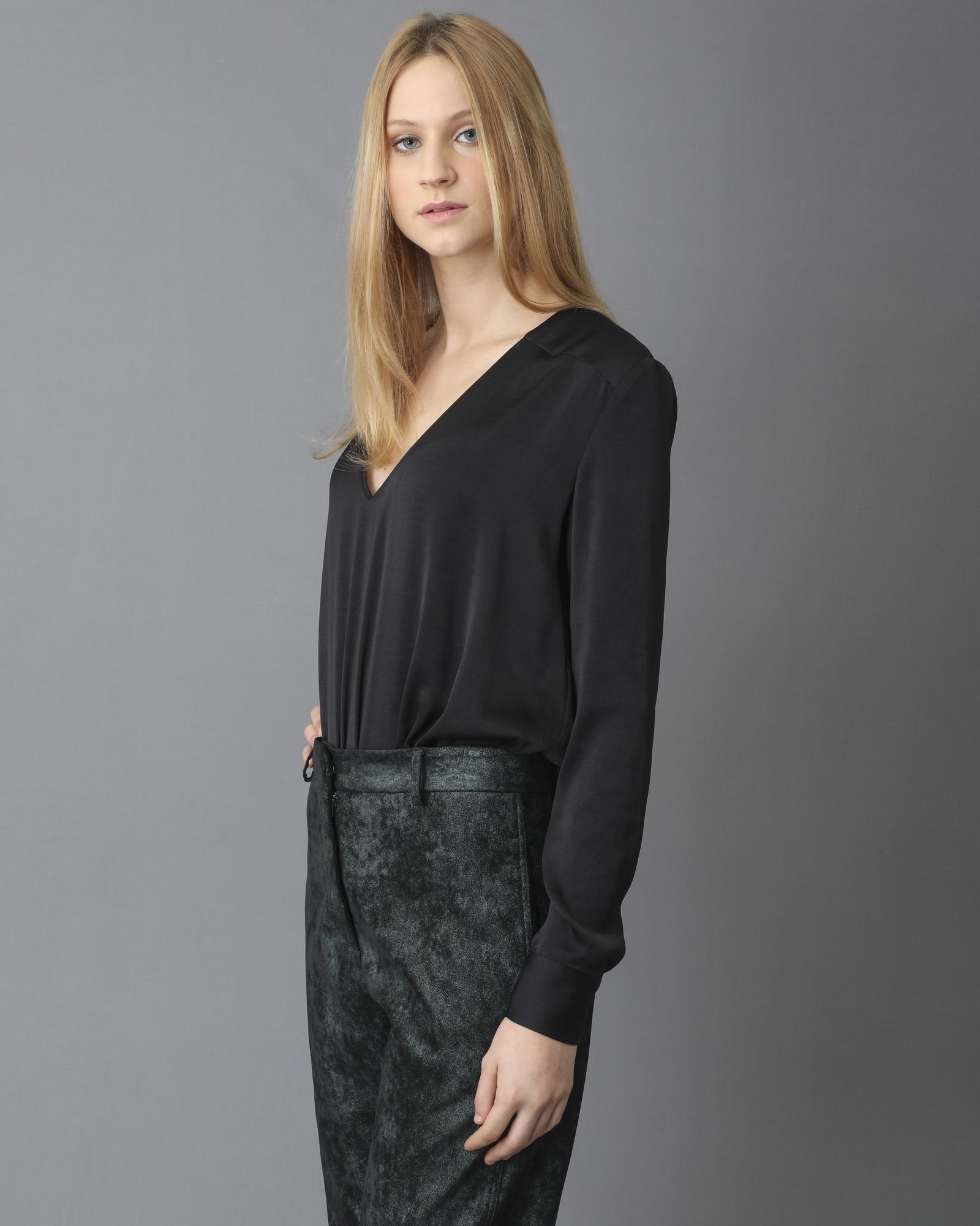 Ce body est très épuré en jersey satiné noir, adopte une coupe légèrement flatteuse et présente un col V ainsi que des boutons qui maintiendront ses manches bien en place. Son string restera invisible sous tous vos vêtements.